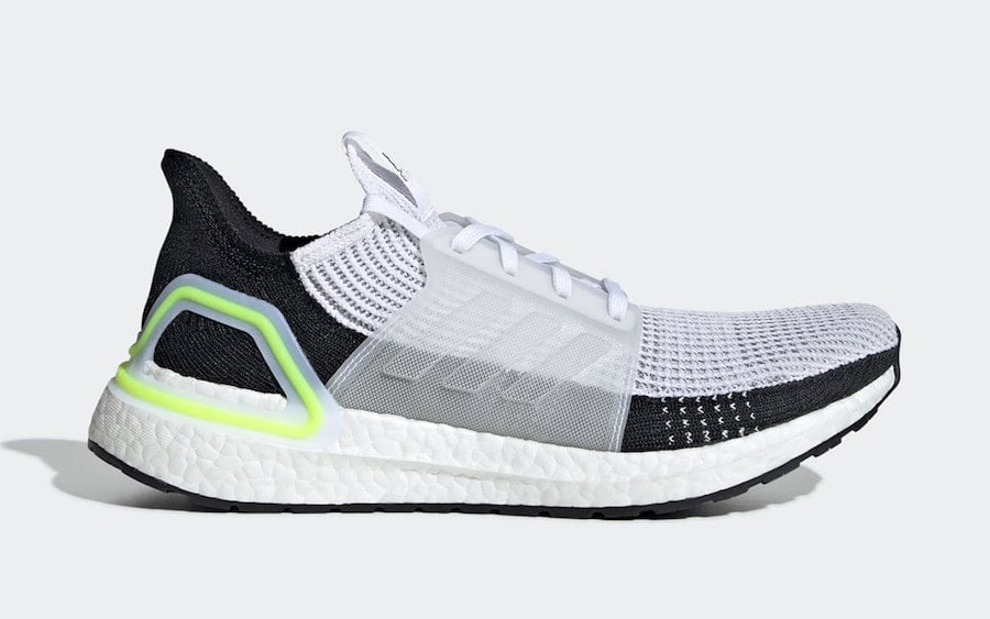 Looking closer it features White and Black Primeknit on the upper while it utilizes a translucent lace cage. Sticking out is Volt on the heel clip while White covers the Boost midsole and Black lands on the rubber outsole which completes the look.