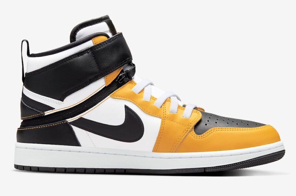 Specifically, the shoes are dressed in a Yellow Ochre, White, and Black color combination. Tobie Hatfield designed the unique structure and features a unique entry technology for those with disabilities to remove or put on the Air Jordan 1 High FlyEase. Utilizing a side zipper for support and adjustable straps that offer a customized fit. Like the others, the shoes are constructed with leather, while perforations land on the toe box, and mesh tongues aid in breathability. The Wings logo adorns the strap with the Jumpman on the tongues. Other details include a White midsole and a Black rubber outsole.