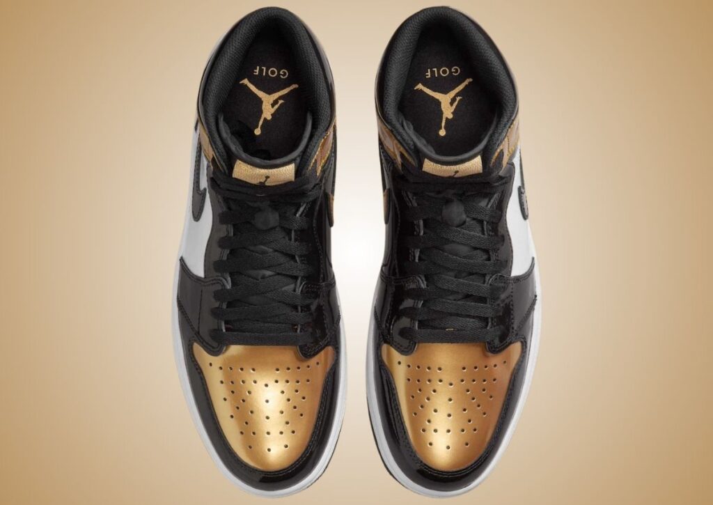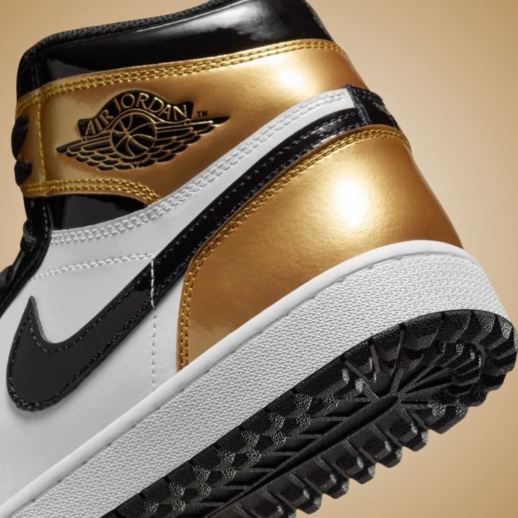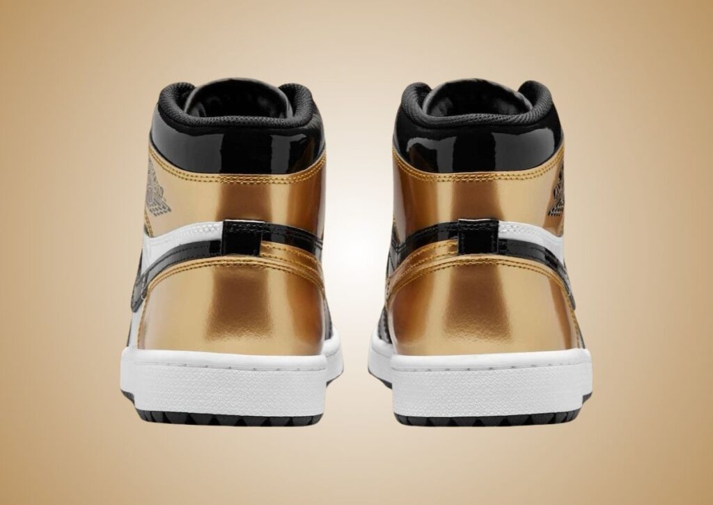 As you can see, this Air Jordan 1 Golf features a Black, White, and Metallic Gold color scheme. This golf iteration features Metallic Gold accented by sleek Black and White panels. The patent leather overlays elevate the design with a polished, luxurious finish. The shoes also come with classic branding, including the Air Jordan Wings logo and Nike Swoosh, paying homage to the shoeโs basketball origins. Like all golf shoes, this pair features a unique outsole with enhanced grip instead of using the signature golf spikes.