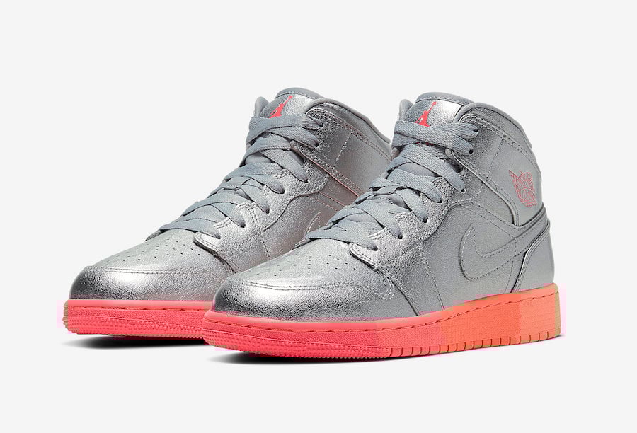 This grade school exclusive comes dressed in a Metallic Silver, Racer Pink, Wolf Grey and Hot Punch color combination. This mid-top Air Jordan 1 features Silver across the entire upper while bright shades sectioned off on the midsole. Other details includes Pink on the Wings logo and Jumpman on the tongue while Punch covers the insoles.