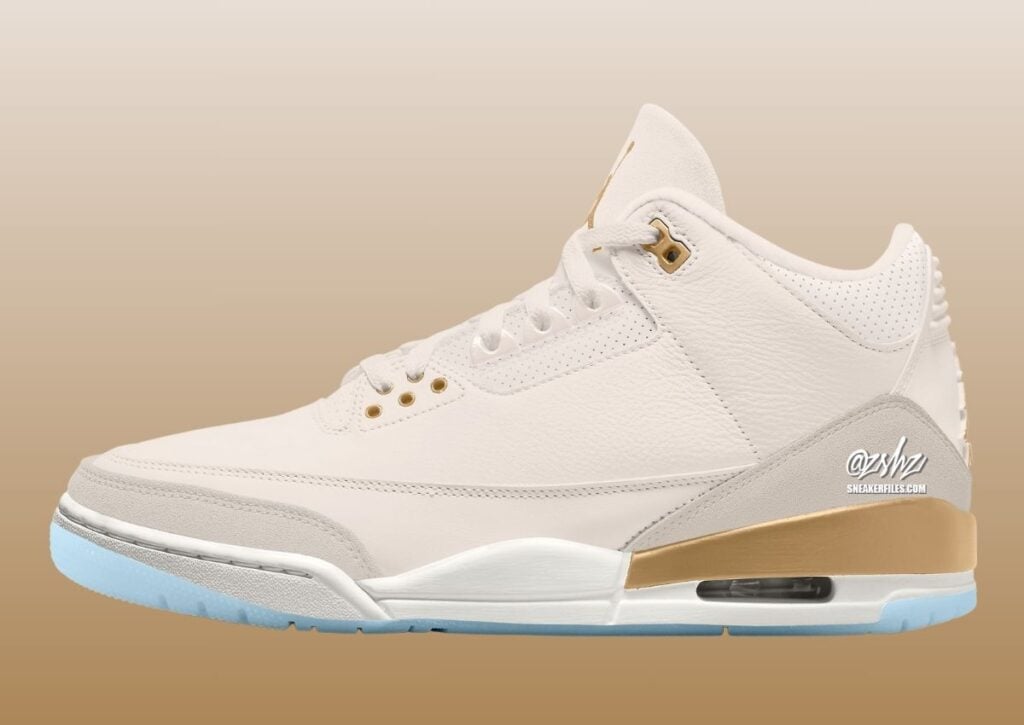 This Air Jordan 3 will feature a mixture of colors and premium materials. Highlighted with a Sail upper, a Grey hue in suede appears around the toe and heels, replacing the signature elephant print. Gold adorns part of the midsole, eyelets, and Jumpman on the tongues and heels for a luxurious feel. Other than the Gold details, White lands on most of the midsole, allowing the aforementioned shade to stand out. Lastly, a Blue icy translucent outsole completes the design.