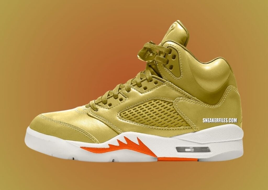 This Air Jordan 5 comes dressed in a Metallic Gold, Brilliant Orange, Sail, and Muslin color scheme. At the time of writing, the color blocking has yet to be confirmed. However, due to the description, itโs likely the shoes will feature Metallic Gold across the upper with accents of Orange, which lands on the shark teeth. Expect Jumpman branding on the tongues and heels, while a Muslin midsole and a translucent rubber outsole complete the look.