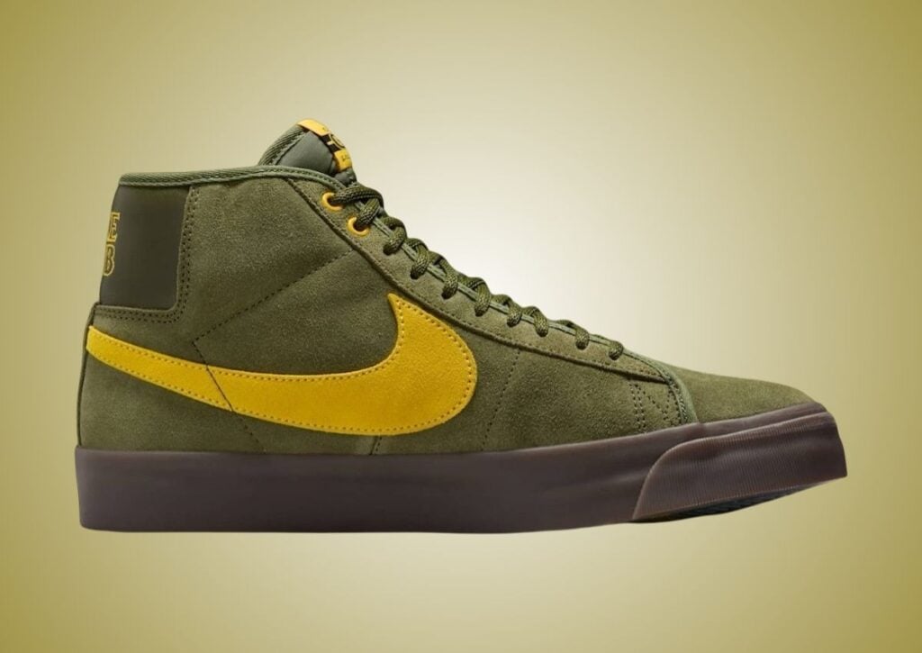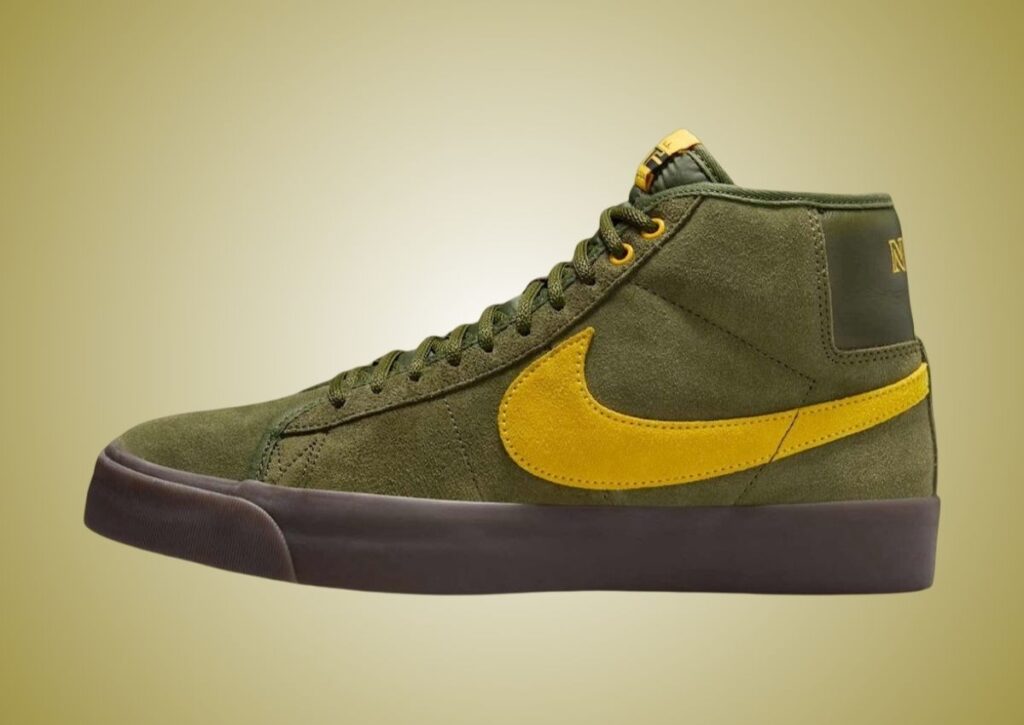 This Nike SB Blazer Mid comes dressed in a Rough Green, Amarillo, and Black color scheme. Going over the shoes, it features Green suede across the upper with an earth feel. More Green graces the nylon tongue and laces. The tongue labels have co-branding done in Yellow and Black, which will stand out from the base. Yellow also appears on the large suede Swoosh logos, top eyelets, and branding on the leather heels. Other details include a Brown midsole and a translucent rubber outsole that displays an Antiheroโs graphic. Each pair comes with three sets of laces: Yellow, Green, and White.