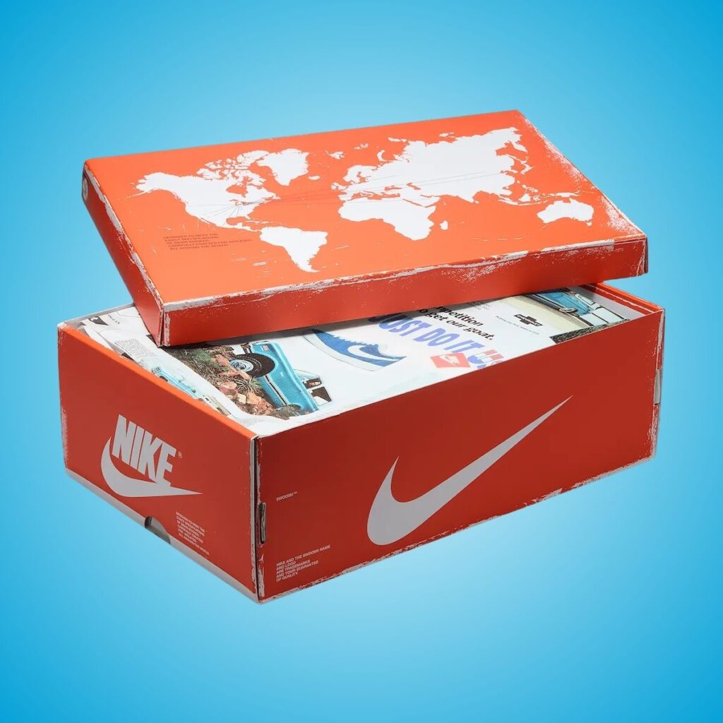 This Nike Blazer Low is dressed in a Surf Blue, Sail, and Gum Dark Brown. As you can see, the shoes feature suede across the upper in Blue, while White graces the large Swoosh on the panels. The heels are also unique, as the backdrop is White with โBOOKโ written across to reflect Blazer PEs from the 1970s. The tongue and insoles feature Chevy branding and an exposed foam tongue. Other details include special hangtags of the Chevy logo and D/B Blazer, a Gum sole, and retro packaging with paper inspired by old-school car catalogs.
