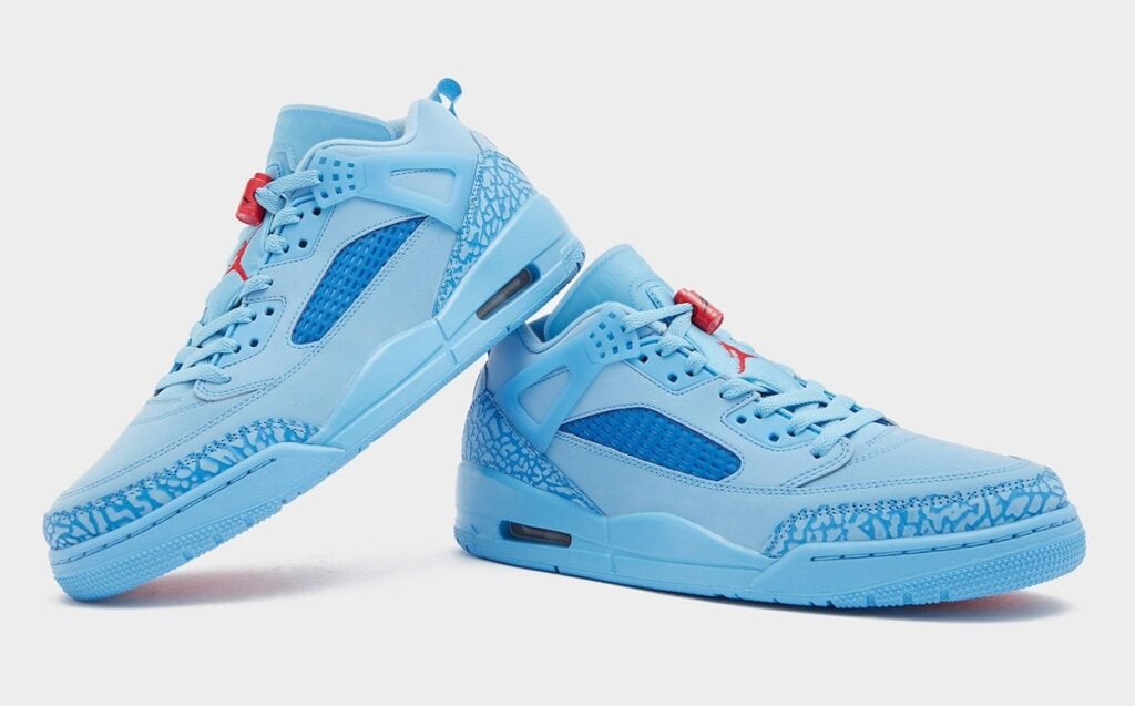 Although this Jordan Spizike Low wonโt have official ties to the Houston Oilers (or the Tennessee Titans), the color scheme of Football Blue, Fountain Blue, and University Red remind us of the once football team. Highlighted with shades of Blue across the upper and constructed with nubuck. Elephant print wraps the toe and heels, with blue on the tongues and a darker shade on the netting. University Red adorns the Jumpman on the tongues, lace locks, and heel branding. Other details include Blue across the rubber sole and the traditional visible Air unit in the heels.