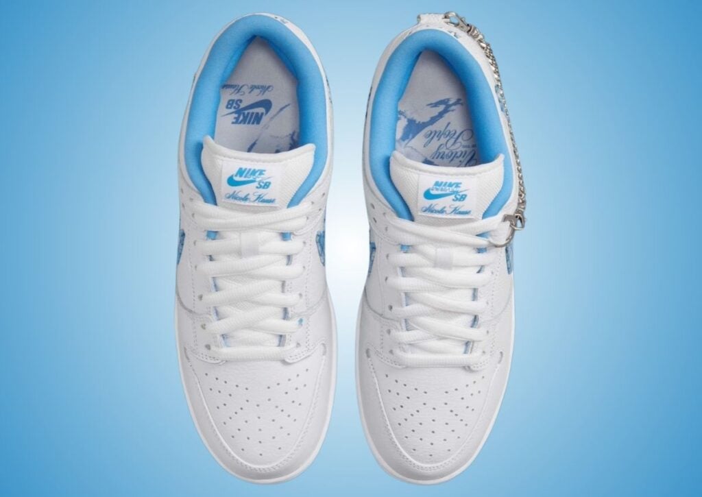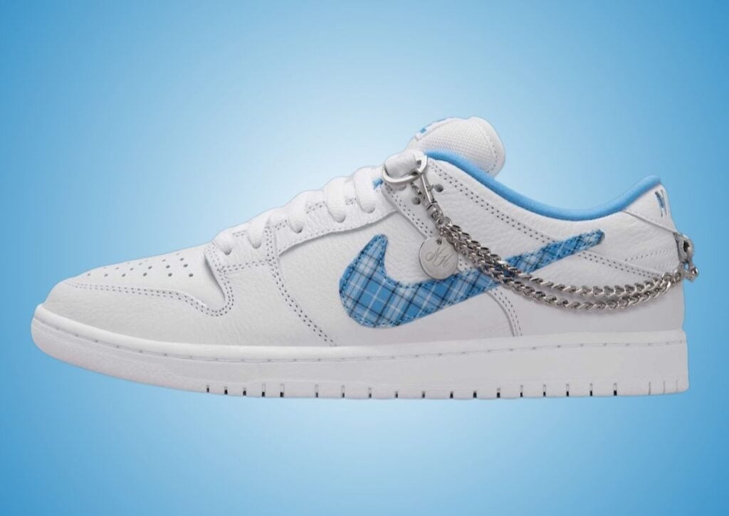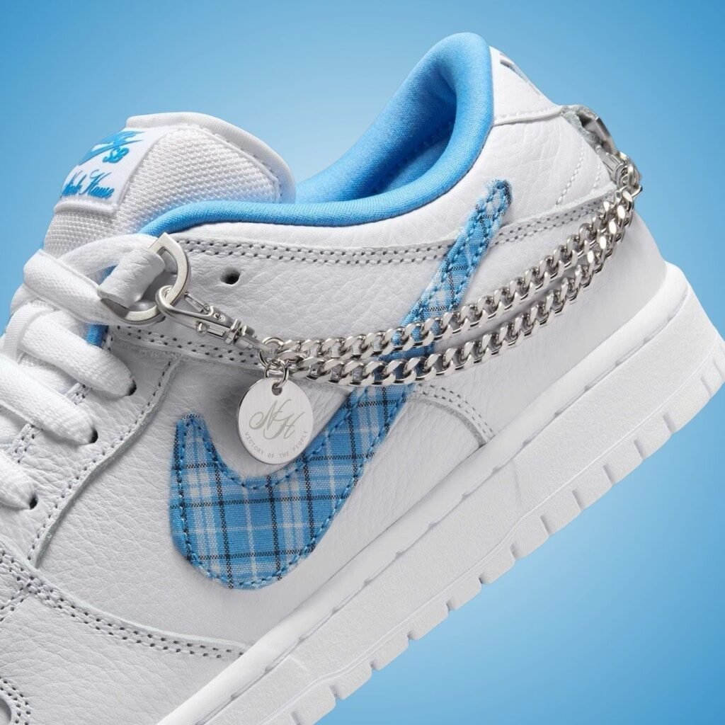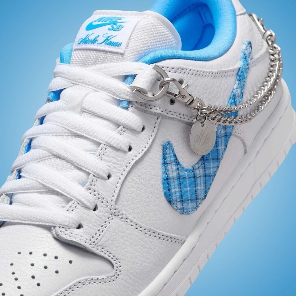 Nicole Hauseโs Nike SB Dunk Low features a White tumbled leather upper, allowing this pair to have a clean base. Adding to this special collaboration, we have Blue plaid on the Swoosh across the panels, inspired by Hauseโs style. The same shade of Blue drapes the liner along with the Nike SB branding and her signature on the tongues.