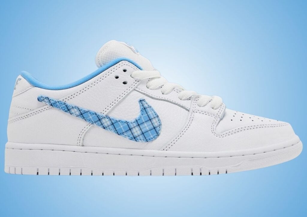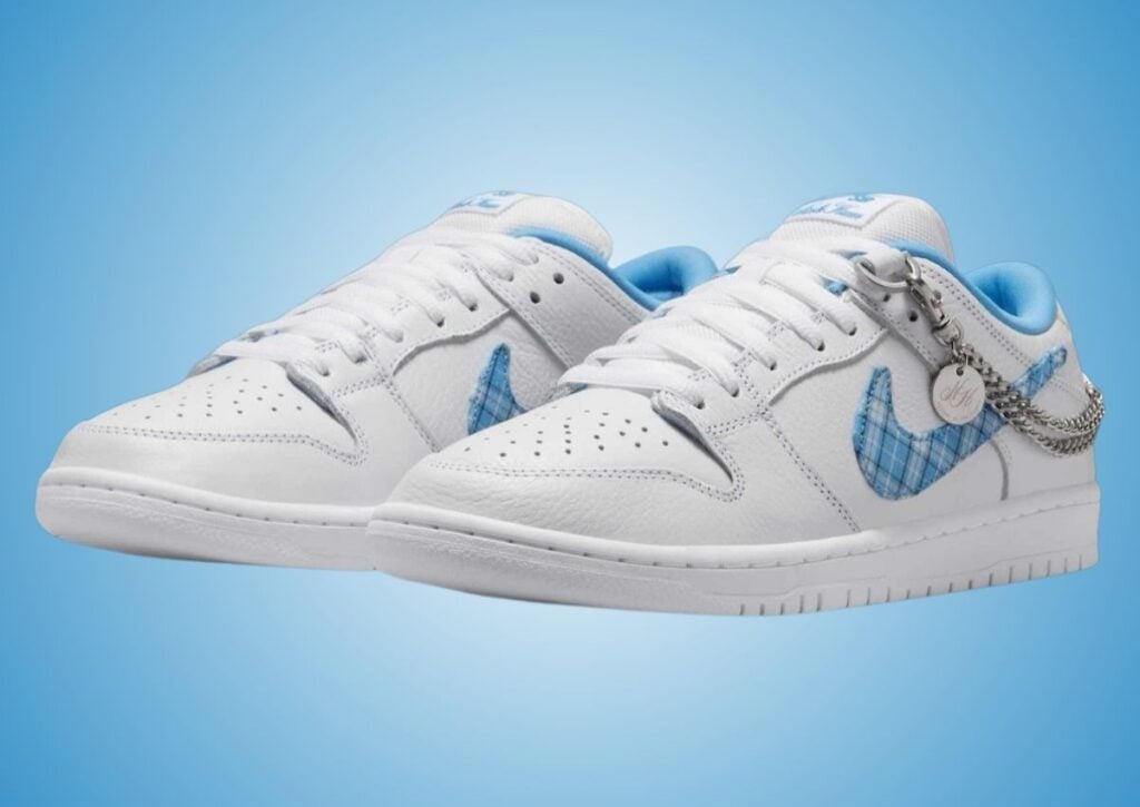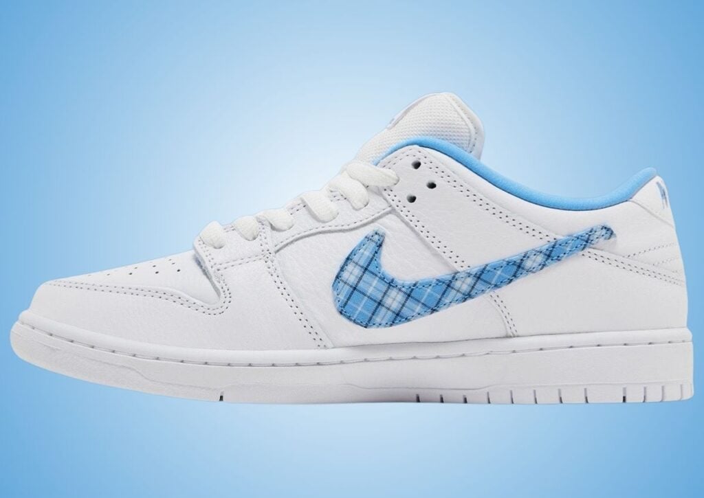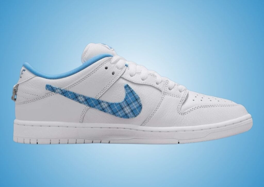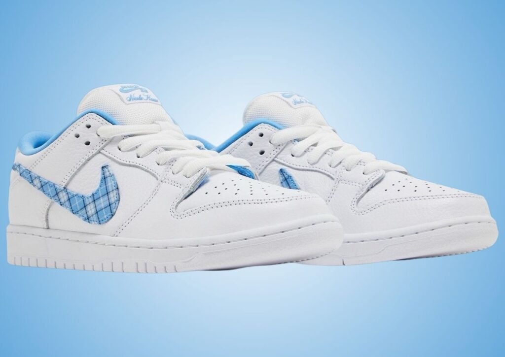 Nicole Hauseโs Nike SB Dunk Low features a White tumbled leather upper, allowing this pair to have a clean base. Adding to this special collaboration, we have Blue plaid on the Swoosh across the panels, inspired by Hauseโs style. The same shade of Blue drapes the liner along with the Nike SB branding and her signature on the tongues.