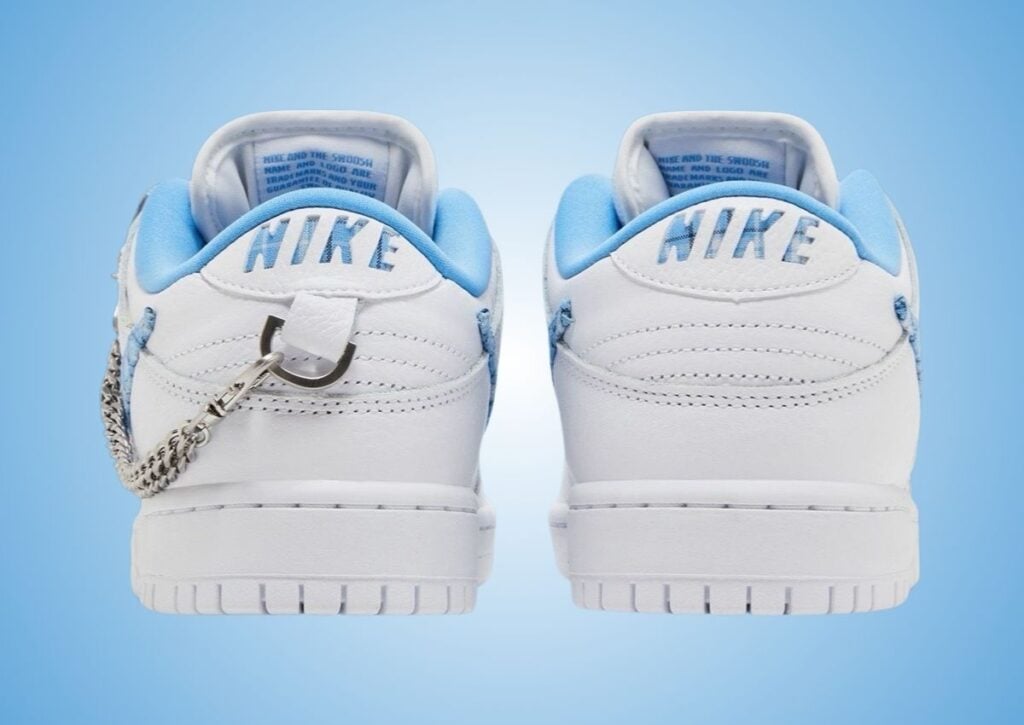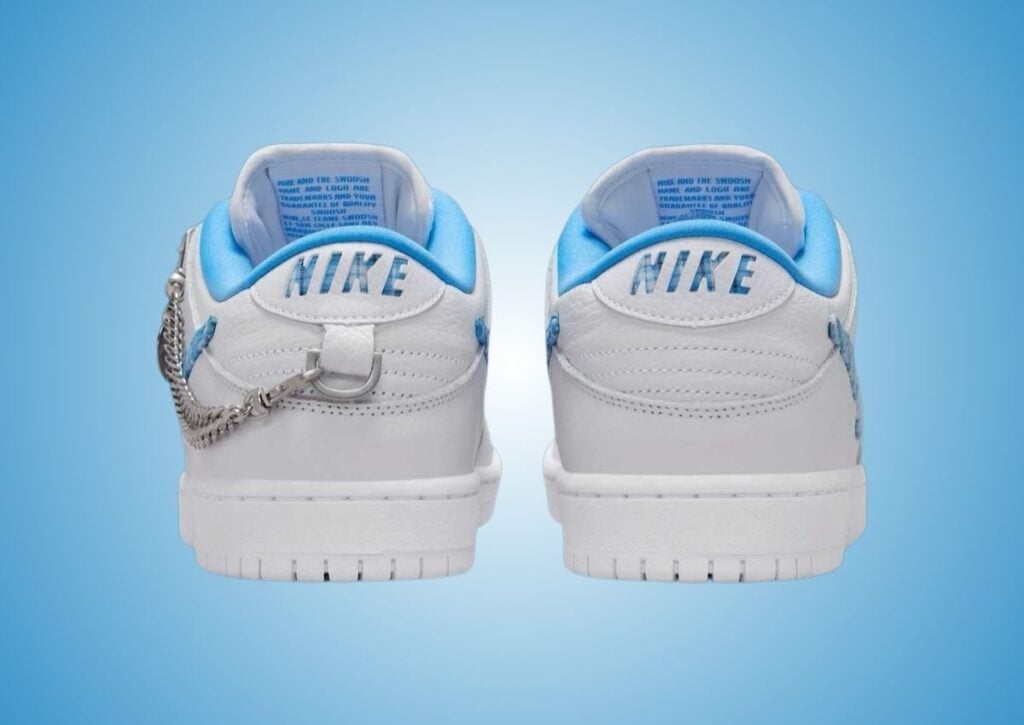 The SB Dunk Low includes detachable chains that embody Hauseโs style and align with its punk-inspired theme. These chains allow users to personalize the sneakers according to their individual style preferences, adding a stylish and practical dimension. A small tag with Nike SB branding is attached to the chain. Completing the look is a White midsole and a matching rubber outsole.