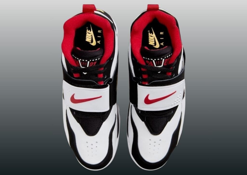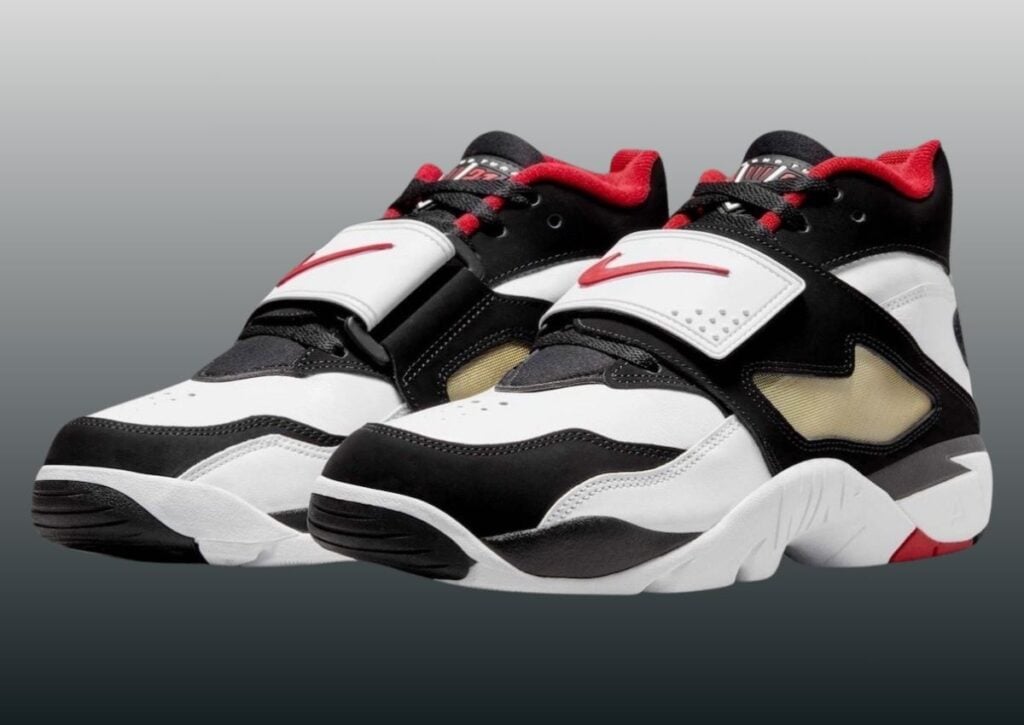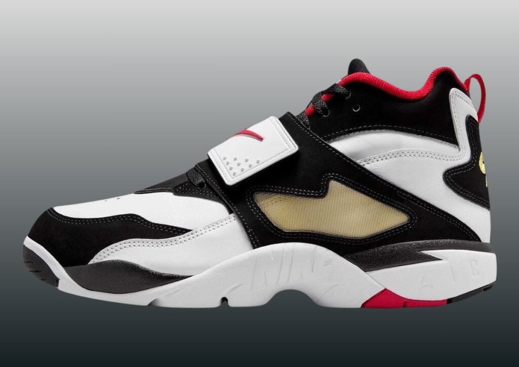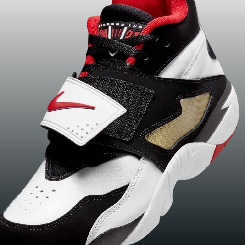 Dressed in a White, Fire Red, Black, and Metallic Gold color scheme, the Nike Air Diamond Turf was not only known as a football shoe but was also worn for baseball. It utilizes the signature black-and-white blocking, is constructed with leather, and features the signature mid-foot strap. In addition, we have Red on the branding, liner, and outsole, further connecting to the Falcons. Other details include Diamond Turf branding on the tongues, mostly White on the midsole, while Black, White, and Red appear on the rubber outsole.