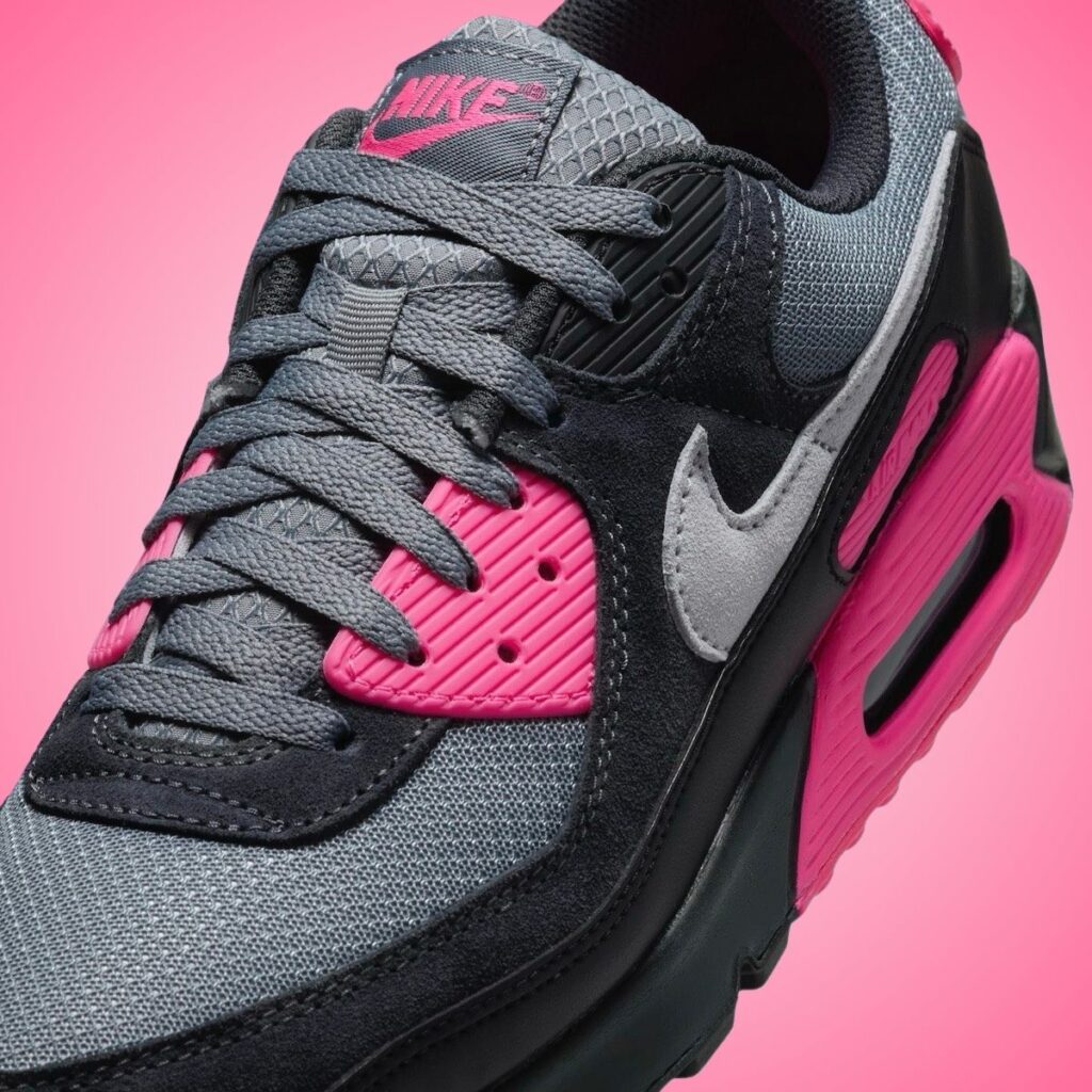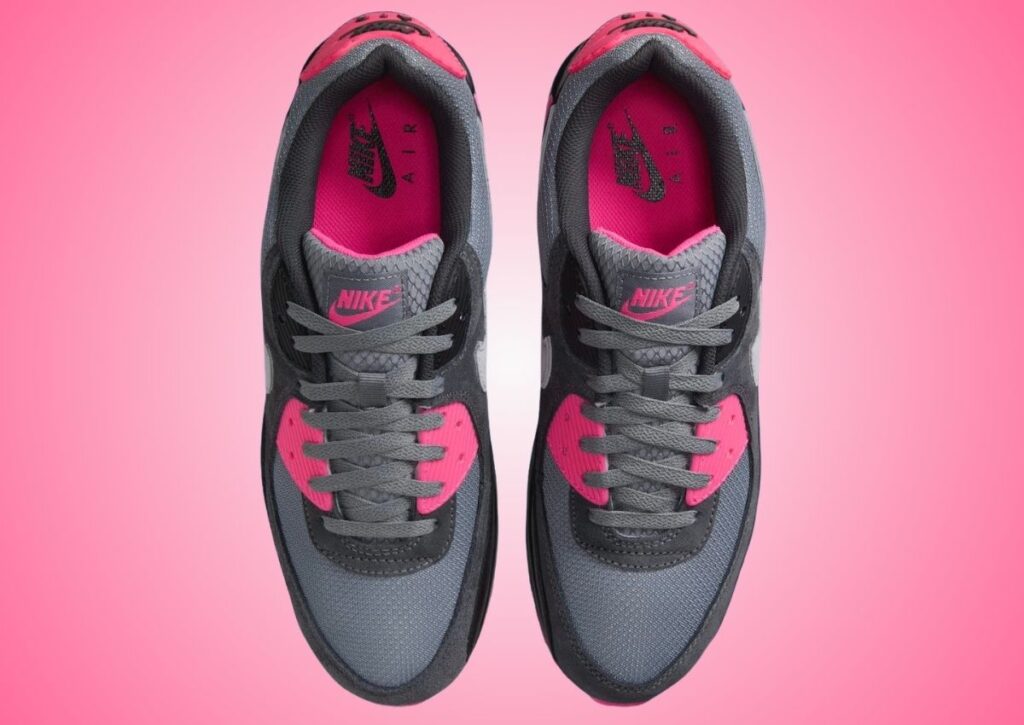 This Nike Air Max 90 features a Cool Grey, Wolf Grey, Hyper Pink, Black, and Anthracite color scheme. Going over the shoes, it features mesh, suede, and leather, which is the traditional Air Max 90 build. Most of the upper comes in darker shades. However, the Pink detailing on the bottom eyelet, Air Max branding, around the Air unit, and heels are head-turners. Next, a lighter shade of Grey graces the Swoosh logos, and Black fills in the Nike Air branding. Completing the design is Black and Pink on the rubber outsole.