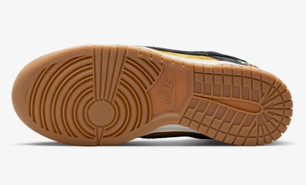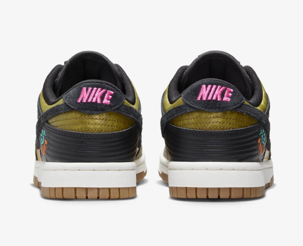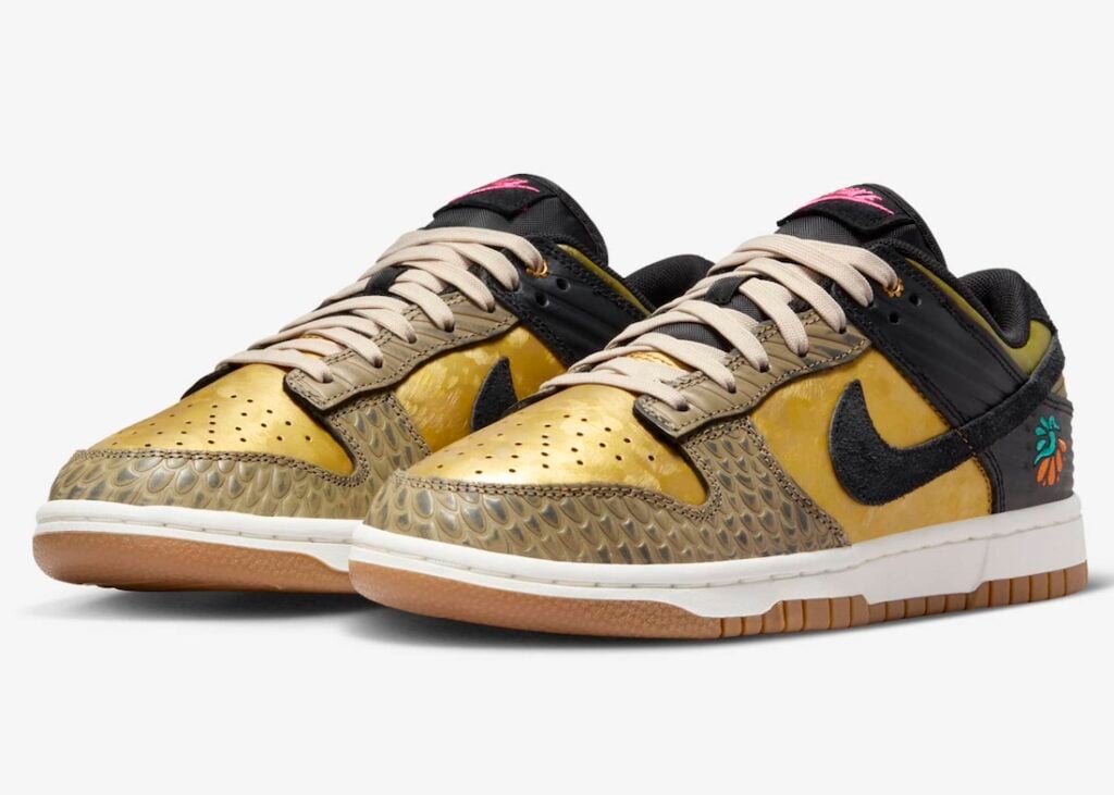 Dipped in a Black, Khaki, Metallic Gold, Medium Ash, and Sail color combination. This Nike Dunk Low has textured leather on the upper and reptile texture across the overlays. Borrowing cues from the marigold and hummingbird are connected to the Dรญa De Muertos history. Suede adorns the Swoosh logos and heel tabs with Pink branding on the tongues and heels. Other details include aged laces, a White midsole, and a Gum rubber outsole.