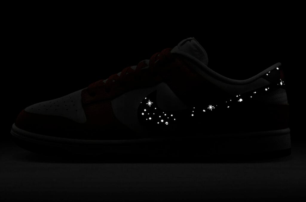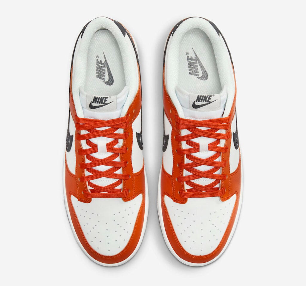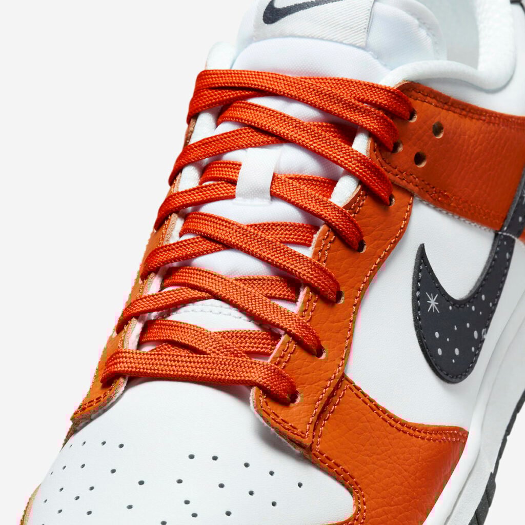 This Nike Dunk Low comes dressed in a Campfire Orange, Anthracite, and Summit White color combination, which is an interesting choice for it being inspired by the night. Utilizing leather throughout with Orange on the overlays, eyestays, and laces. The same material appears on the toe box, panels, and collar. Highlighting the sneakers, we have Anthracite on the Swooshes and heel tabs with 3M reflective stars, allowing it to pop at night. Other details include a White midsole and Anthracite on the rubber outsole with speckled detailing.