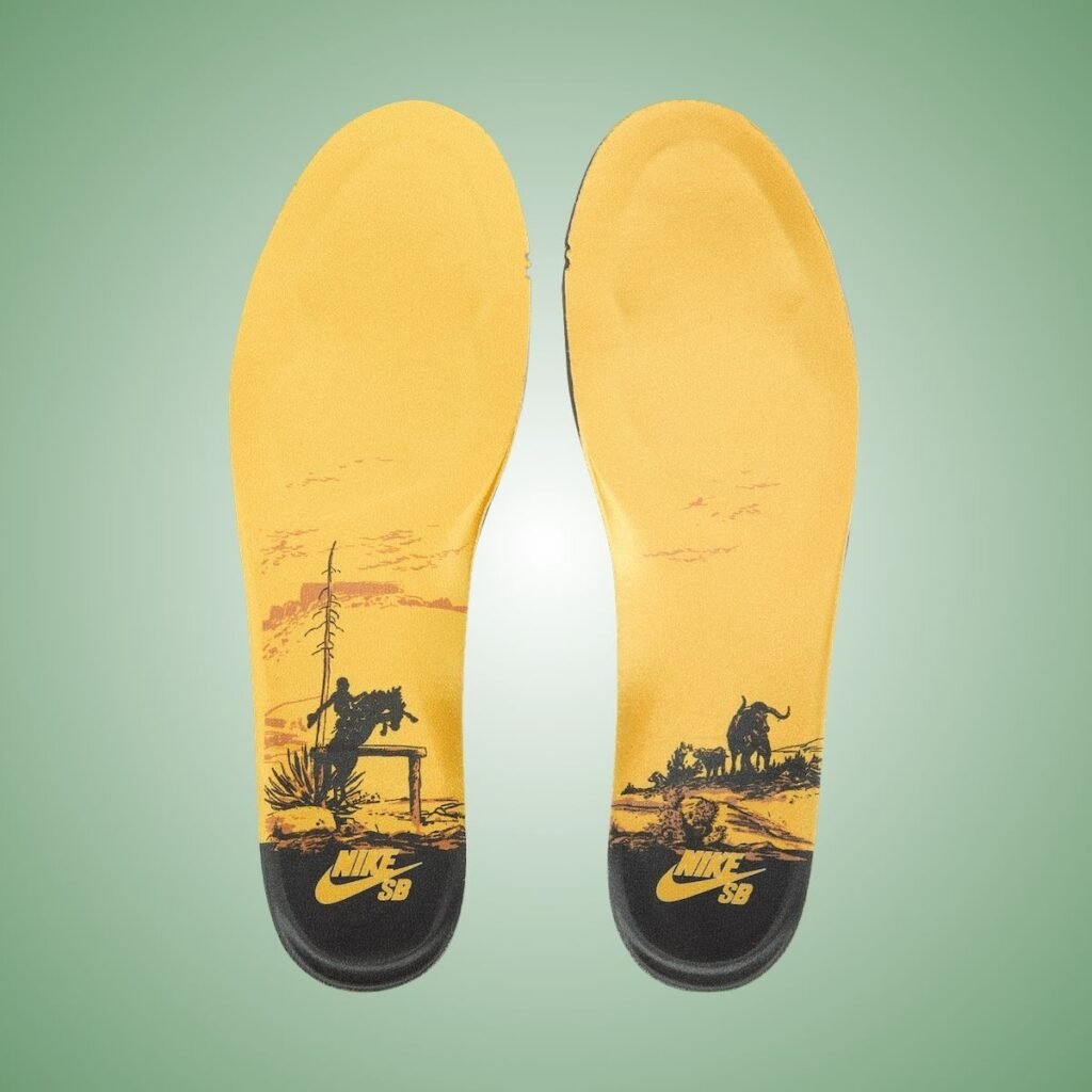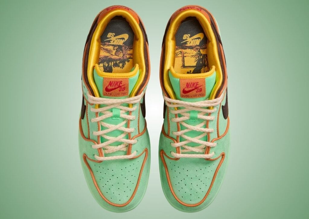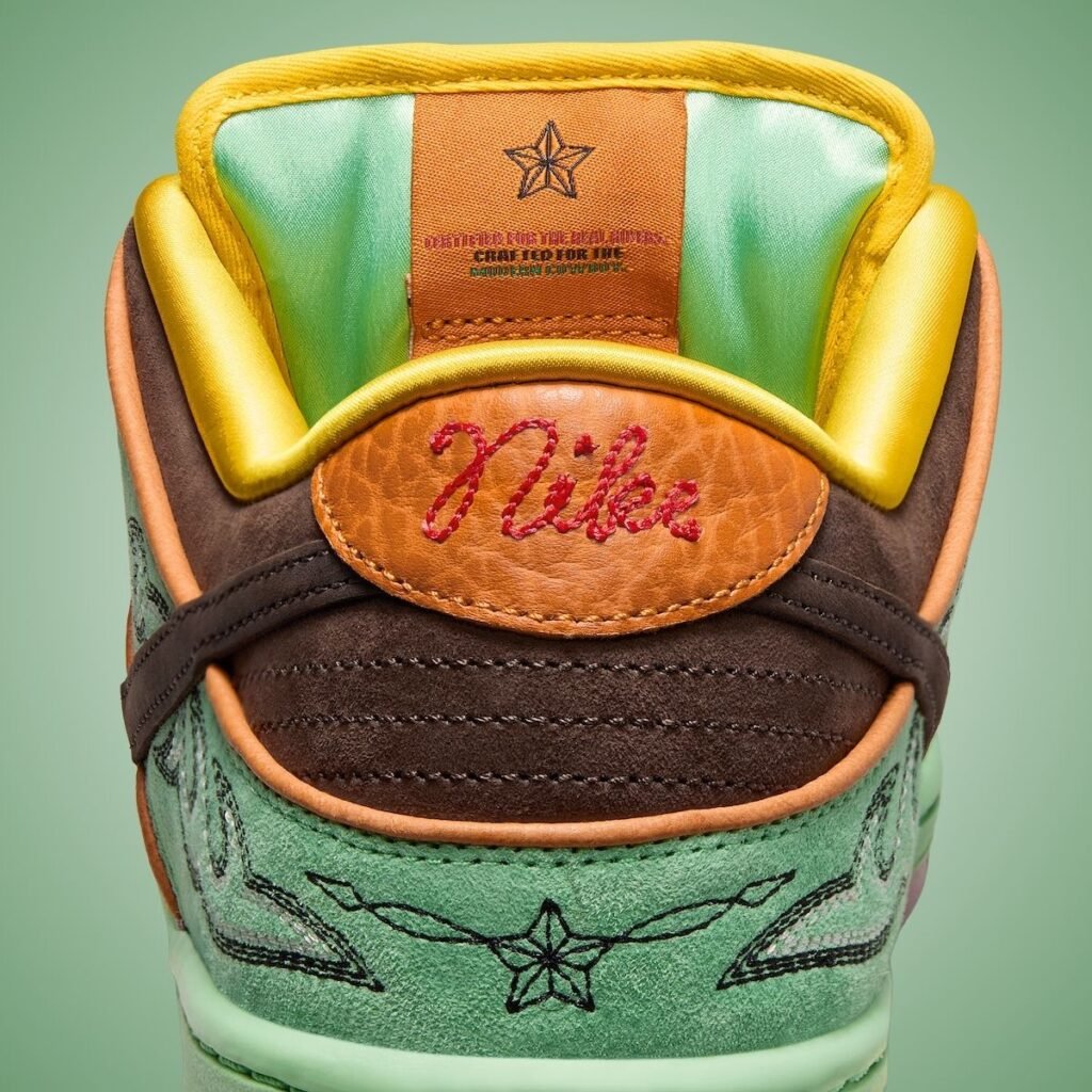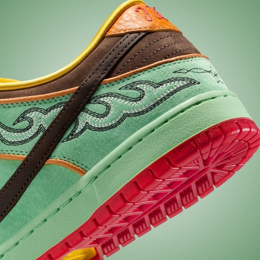 This Nike SB Dunk Low is dressed in a Tourmaline, Baroque Brown, and Monarch color scheme. Highlighted with Green across the suede upper. The pair also comes with unique designs on the lateral side, and rope laces that are inspired by lassoed rope, which the Nike branding on the heel features the same theme. In addition, Baroque Brown adorns the ankle with a Yellow hue outlining the pipping on the collar, liner, and tongues. Monarch (Orange) outlines the Swooshes, outlines the overlays, and covers the heel with Nike cursive. The insoles come with a design with a man riding a horse and a bull in the background. Other details include Green on the midsole, a Red rubber outsole, and a star on the heel.