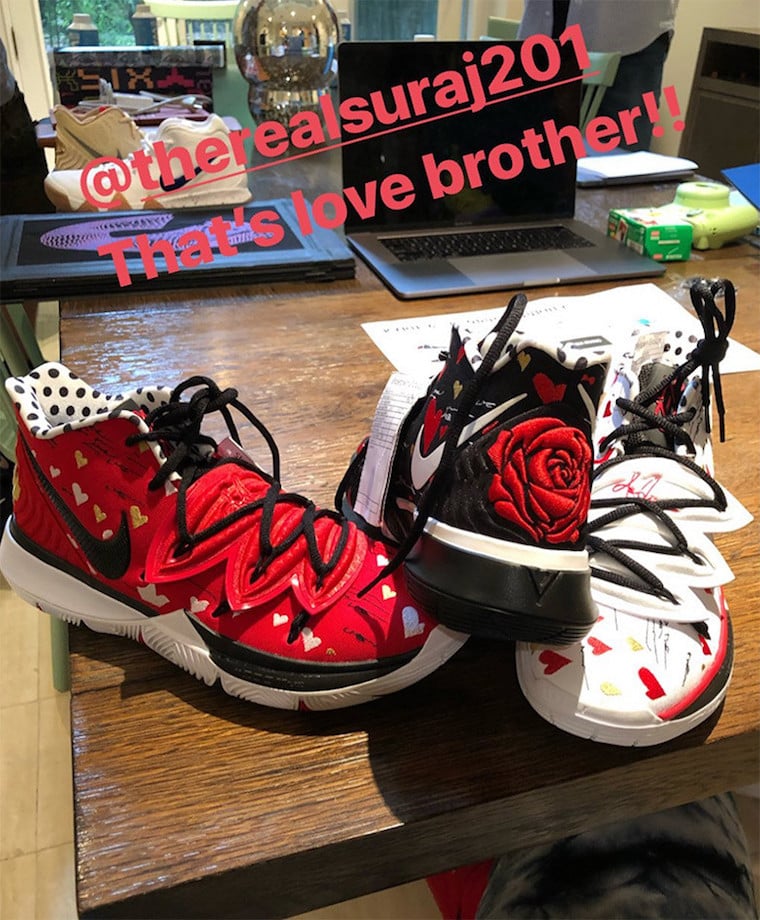 Three color options of the Kyrie 5 is shown which comes in Red, Black and White. Inspired by the passing of their mothers, each shoe comes with colored hearts on the upper while an embroidered rose logo lands on the heel. Finishing the look is polka dots on the liner.