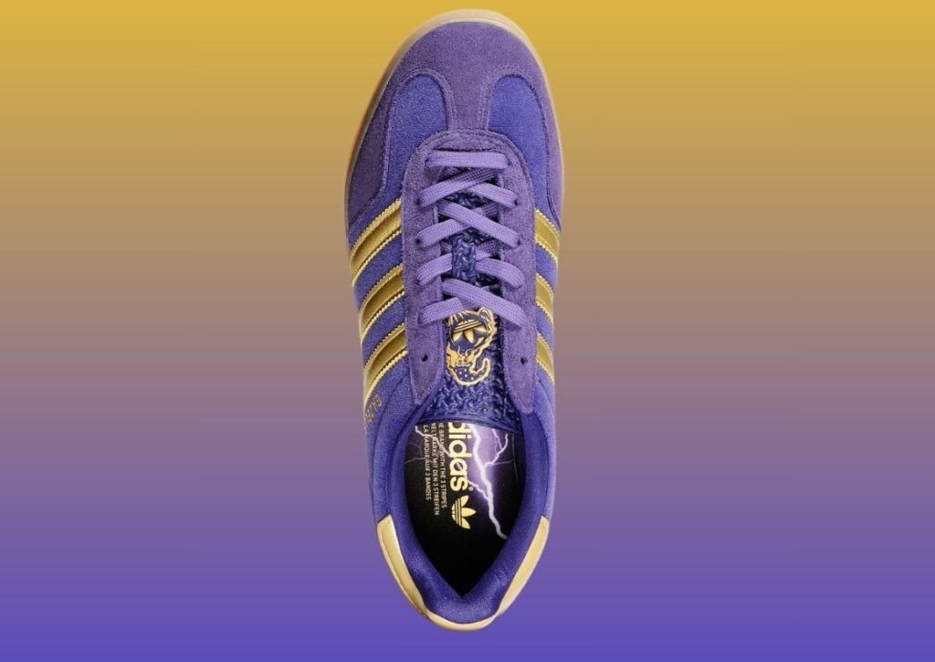 The โWizardโ edition of the adidas Gazelle Indoor features a Purple suede upper, giving the shoes a premium feel. Shimmering Metallic Gold details fill in the iconic Three Stripes branding and heel tabs, while the midsole features Gum, and the outsole has a translucent finish. The design showcases a blend of magical elements, including a Merlin-inspired graphic on both the tongue and heel. Additionally, a custom metal hangtag combines the logos of West NYC and adidas, enclosed within a crystal ball. Lastly, the insoles have lightning bolts across them.