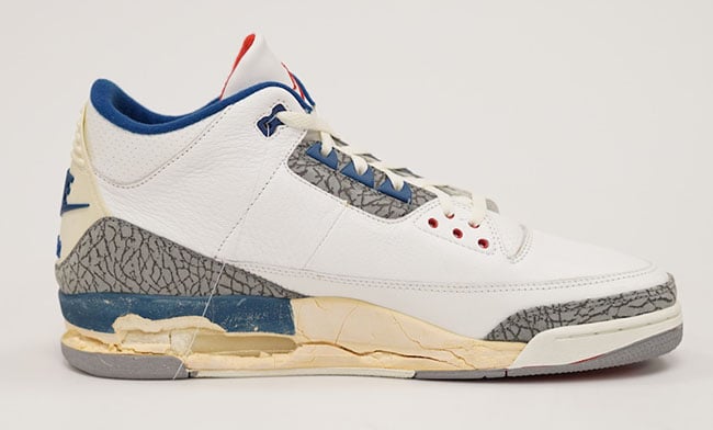 Aside from the cracking, this Air Jordan 3 is still in pretty good shape. While the 2016 release is identical to the original, they do come close. Using the Nike Air and True Blue helps, but they went a step further by adding Red on the inside of the tongue.