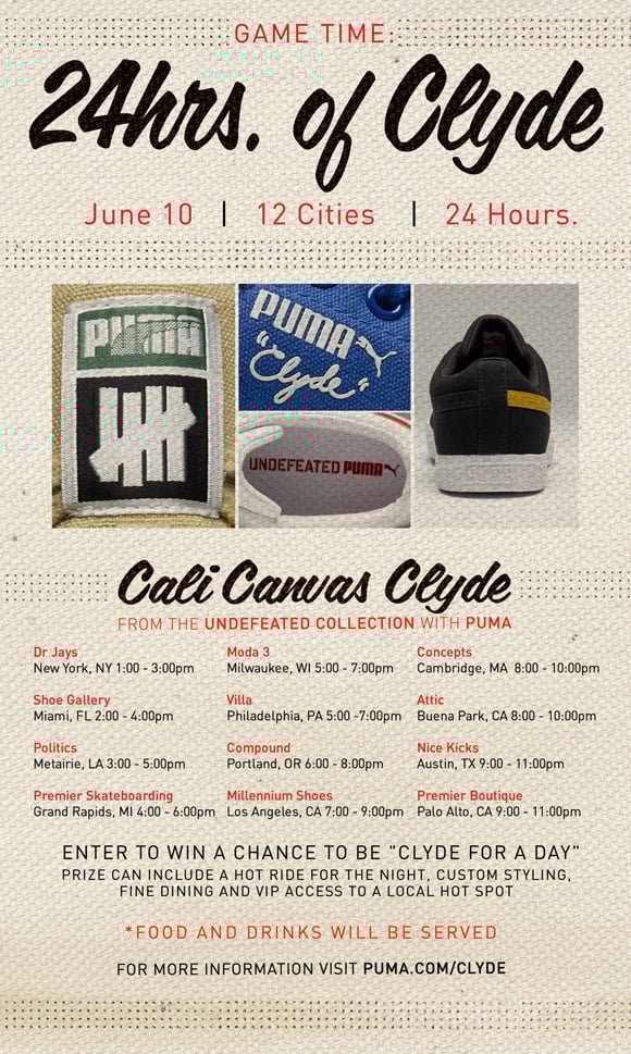 In homage to the Clyde’s namesake, legendary baller Walt “Clyde” Frazier, PUMA is hosting 24 Hours of Clyde to mark the June 10th launch: 12 two-hour parties staggered throughout the day at retailers across the country. (See attached for the official invite.) In addition to checking out the new Clydes, at each event, guests will have the chance to enter to win PUMA’s “Clyde for a Day” prize pack. The winner in each city will experience a day, Clyde-style, complete with elements like a chauffeur, custom fitted suit, fine dining, and VIP access at a local nightspot.