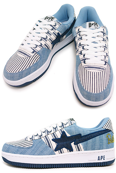 With the Los Angeles A Bathing Ape store well under way, the Japanese company also delivers three new Bapestas that feature a denim theme. Each Bapesta features a combination of denim and stripped patterns in three color-ways. Furthermore, the logo appears in a rope design seen at the back of the shoe. Now available at Cliffedge.