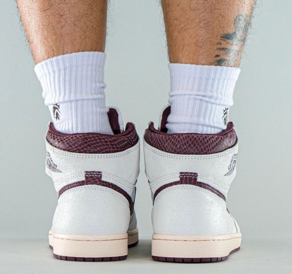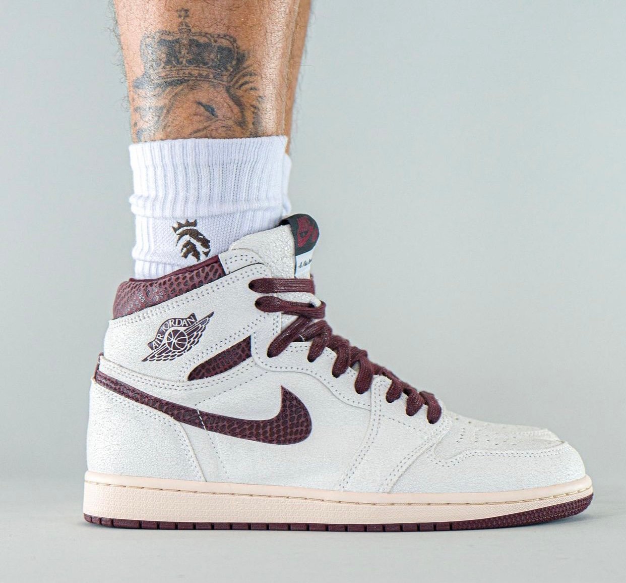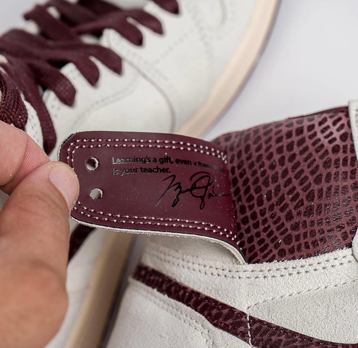 This Air Jordan 1 comes dressed in a Sail and Burgundy color combination. Constructed with a premium build, the pair has a Sail suede across the base, overlays, and tongue, while reptile texture (possibly snakeskin) adorns the ankle collar and Swoosh logo. Furthering the theme, quilted materials land on the liner, co-branding appears on the tongue, and signature from Michael Jordan beneath the ankle overlay that reads, โYou have to expect things of yourself before you can do them.โ Next, Burgundy covers the laces, Wings logo, and rubber outsole. Other details include a Sail midsole and a special label on the insoles that reads, โAirness by A Ma Maniere for Air Jordan.โ