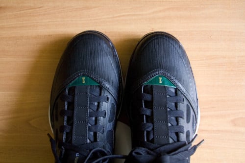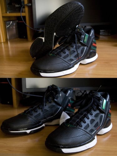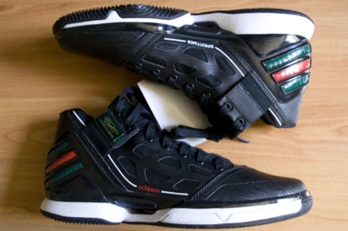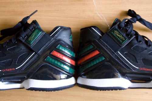 Although the AdiZero Crazy Light has yet to hit retailers, we get an early look at Derrick Rose second model, the Adidas AdiZero Rose 2.0 in Black/Forest Green/Red. The same SPRINTWEB and SPRINTFRAME technology that was featured on the first model will make its way back on the AdiZero Rose 2.0. Support straps and mesh panels are present, and overall weight for the sneakers are 12.4 ounces. More pictures below.