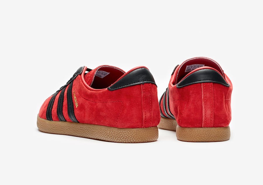 Like mentioned this adidas London comes highlighted with Red suede across the upper while Black leather is used for the leather Three Stripes. Following we have the London branding in Gold while a Gum midsole and rubber outsole completes the look.