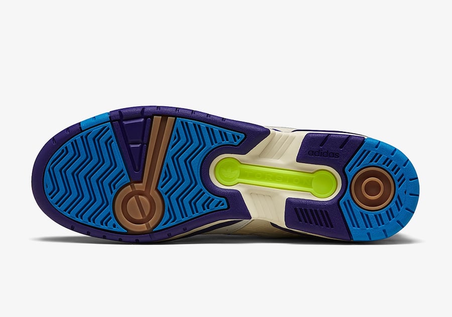 Highlighted with White leather across the upper while Purple, Pink, Bright Blue and Royal Blue accents are spread throughout. Following we have an Off-White hue across the midsole which gives them the vintage look. Other details includes an adidas Torsion system and EVA cushioned midsole.