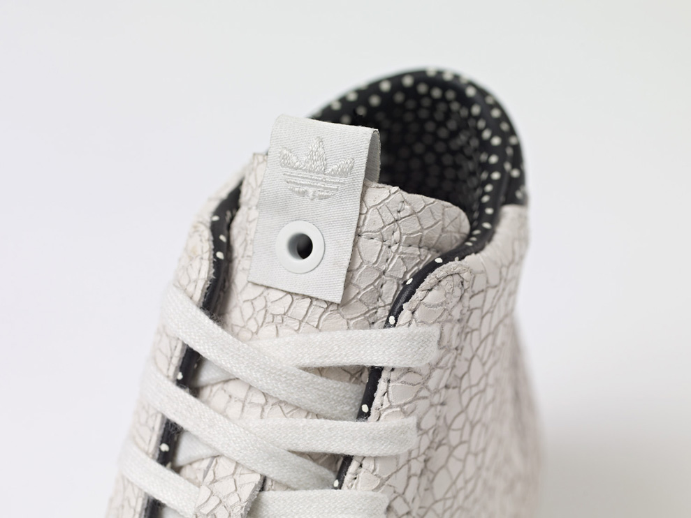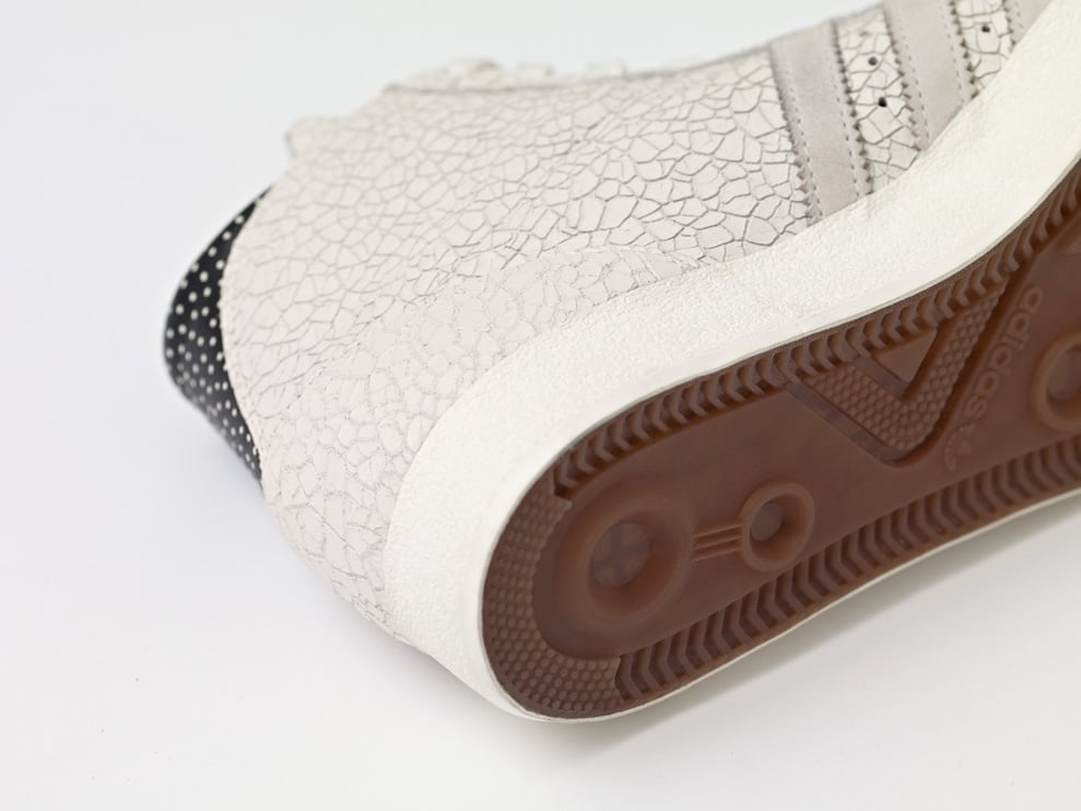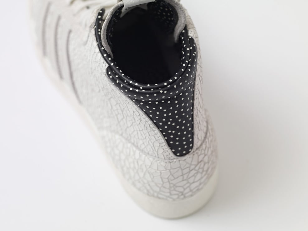Featuring a vulcanized gum rubber outsole and white rubber foxing, the high-top retro basketball kicks see a crackled white leather upper with matching suede Three Stripes branding and black leather hits on the lining and heel with white polka dot detailing throughout.