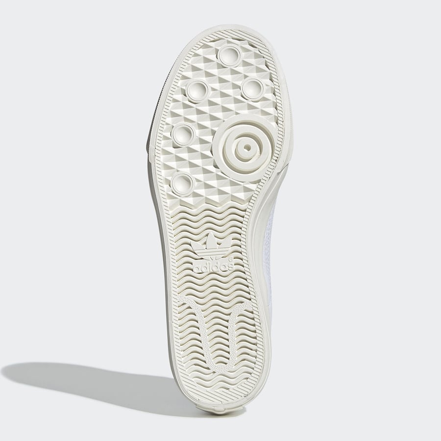 Constructed with a White leather upper, we have nubuck on the overlays while Grey is hinted around the toe. More White is seen on the tongue, laces and liner while Off-White is applied to the vulcanized midsole. Finishing the look is Green accents which lands on the branding on the sides, tongue and covers part of the heel.