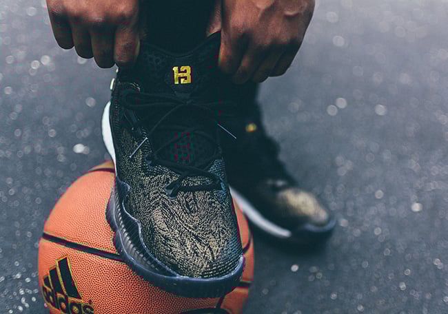 James Harden’s second adidas Crazylight Boost 2016 PE is designed with a black jacquard upper infused with gold waves and matching accents along the outsole, three stripe detailing on the heel and his No. 13 badge featured on the tongue.
