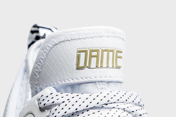The adidas D Lillard 1 All Star opted for a cleaner and more simpler look with a predominate white upper. Black is seen around the toe box which has a reptile pattern, branding at the heel and speckled on part of the midsole. Gold lands on the adidas logo on the tongue.