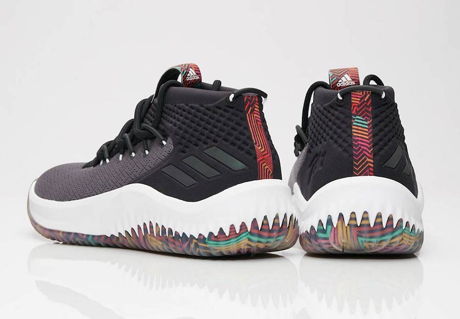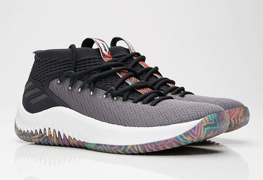 This unique adidas Dame 4 features Black and Grey on the upper while White lands on the lace loops, midsole and branding. The highlight of this pair is the 90s tribal print which runs across the tongue tab, heel and translucent outsole.