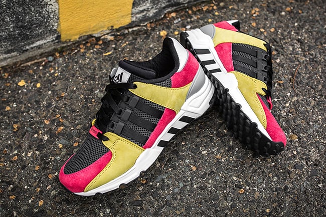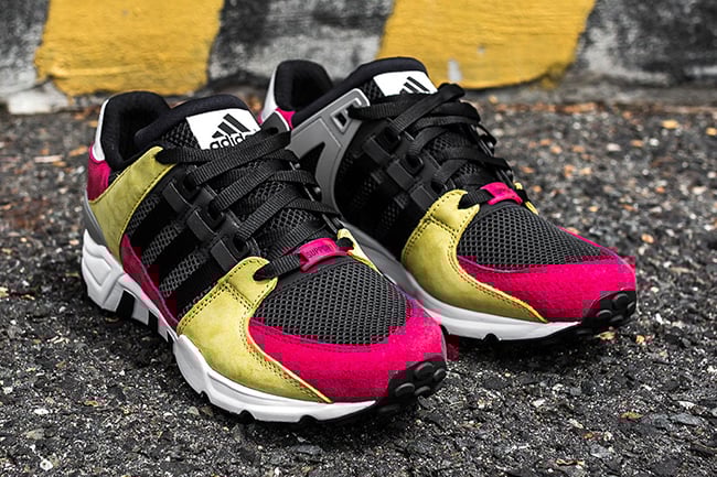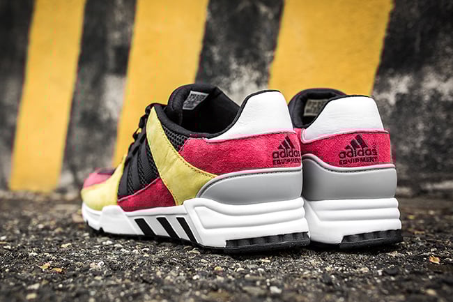 As you can see, this adidas EQT Running Support 93 features a color combination of Yellow, Lush Pink, Black, Grey and White. Color placement is key which allows them to look clean but the materials give them an extra push. On the toe and panels is Black mesh while the overlays of Pink and Yellow are done in suede and the hit of White on the heel features leather. Completing the look is a White midsole with Black landing on the outsole.