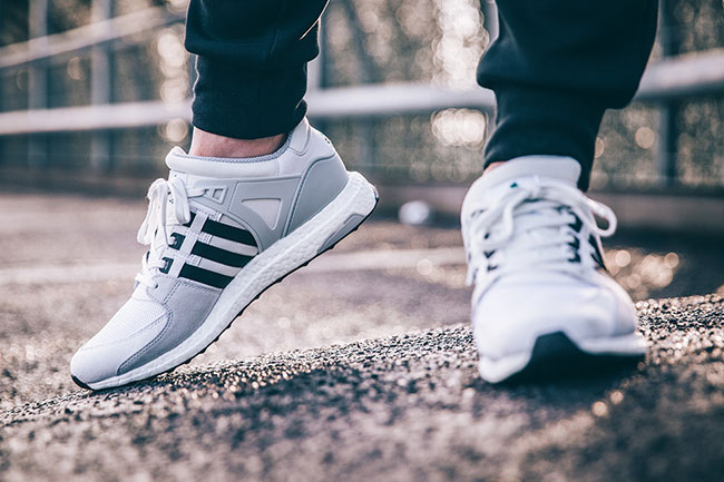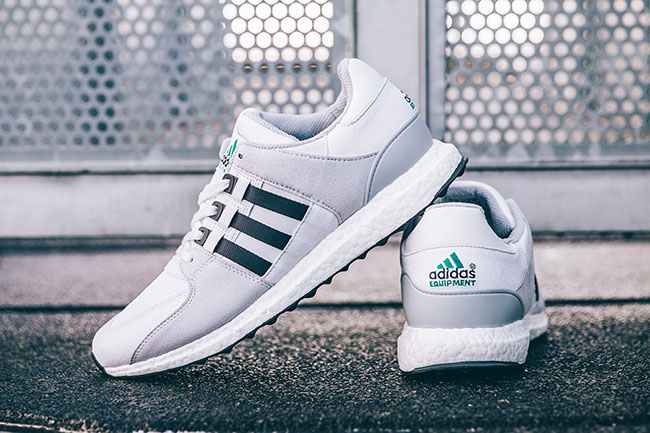 What you may notice about the Equipment Support 93/16 Boost, they use a similar color scheme to the EQT of Vintage White, Core Black and Sub Green however the actual blocking is different. White covers most of the uppers while Black runs down the three stripes which is then followed with minor hints of green. The last detail which could be considered the highlight of this shoe is the Boost midsole.