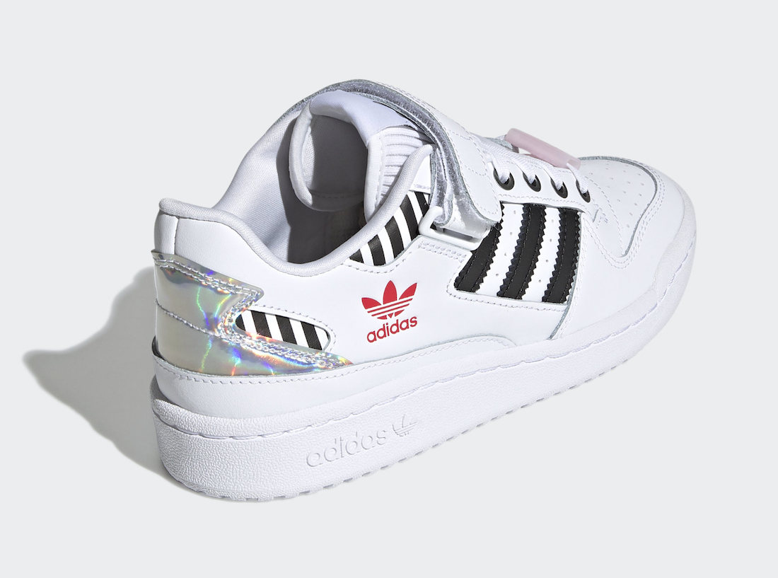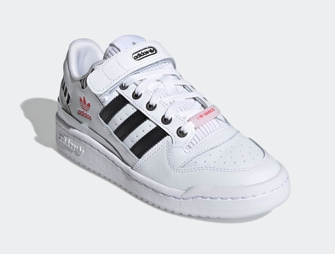 This time, they channel inspiration from the NYC dancing scene through vibrant animal prints and iridescent details. This Forum Low features a Cloud White, Core Black, and True Pink color combination. Utilizing Black on the Three Stripes branding while Red hits the logos and Pink appears on the lace jewel that spells โI [Trefoil] Dance.โ Lastly, a White midsole and matching rubber outsole finish the look.