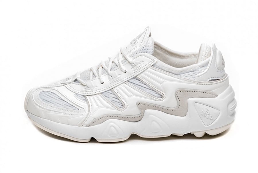 Looking closer it features a White mesh across the upper while leather lands on the sides and toe box. Dressed in all White, it also has shades of Sail and Grey. Completing the look is Torsion technology.