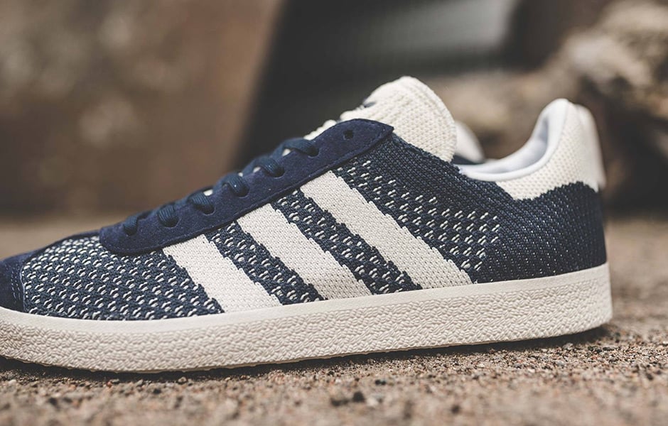 The adidas Gazelle with Primeknit is now launching in a new yet original look. This time around adidas Originals covers the pair in Navy Blue and White.