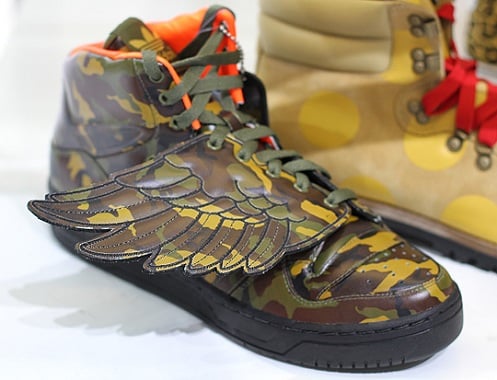 It seems to be as though every time we get a look at one upcoming adidas Originals by Originals Jeremy Scott release, another one isn’t too far behind. This time is like that as well. After showing you the edgy designer’s “panda” sneakers yesterday, today we bring you this look at a camouflage version of the adidas ObyO JS Wings silhouette. At first glance, would you say you’re more taken by the “panda” or “camo” JS Wings sneaker?