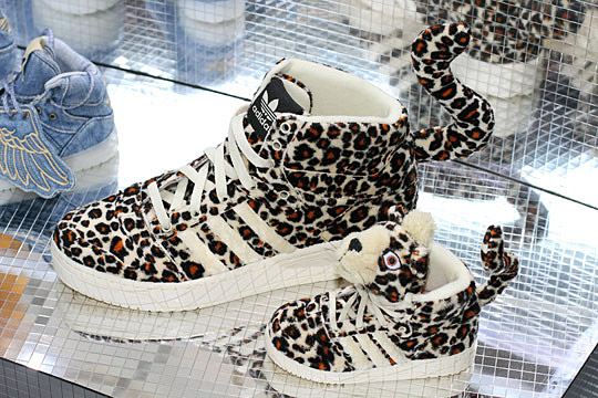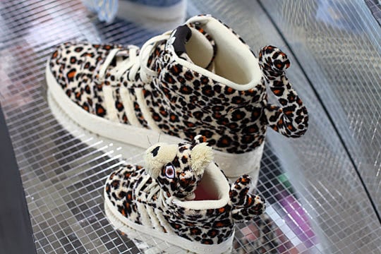 The adidas Originals Jeremy Scott Panda isn’t the only animal inspired sneaker to release. Another animal shifts into sneaker form with the adidas Originals Jeremy Scott Leopard. This sneaker features a leopard print upper, white adidas stripes, laces and solid rubber on the outsole and midsole. But unlike the Panda version, the JS Leopard won’t be sporting the plush leopard head, like the Grade School JS Leopard, but both will feature a tail. This unique concoction of the adidas Originals collab will be available at retailers next Spring/Summer season.