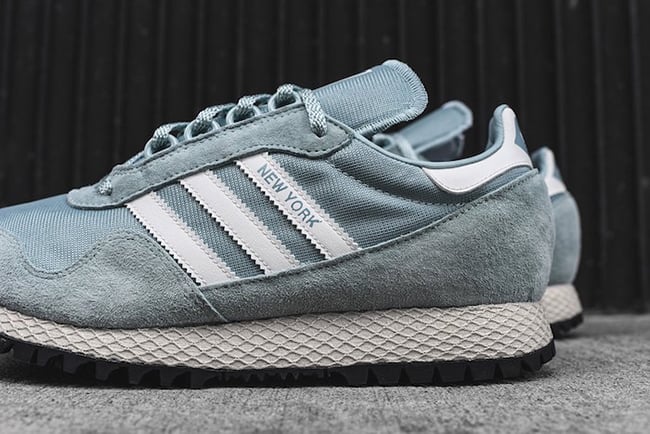This adidas New York features a Tactile Green, White and Black color theme. As for the build, they utilize mesh across the base, nubuck on the overlays while leather is applied to the liner. Having an outdoors feel, they also use D-Ring eyelets and a rubbed outsole. Other details include serrated Three Stripes branding on the panels and an EVA midsole.