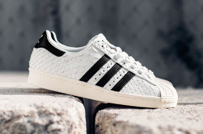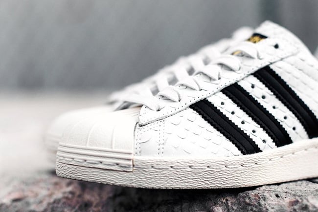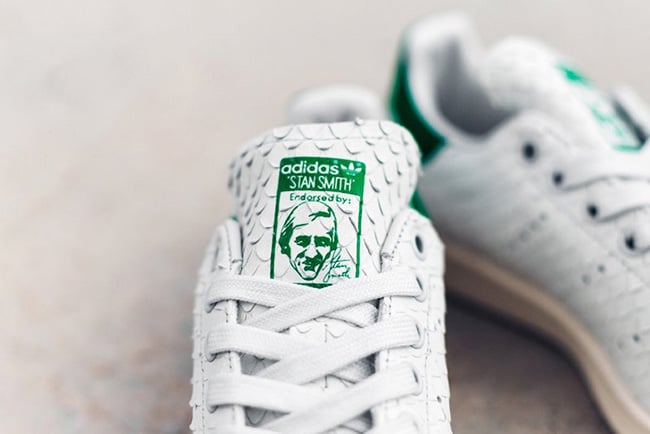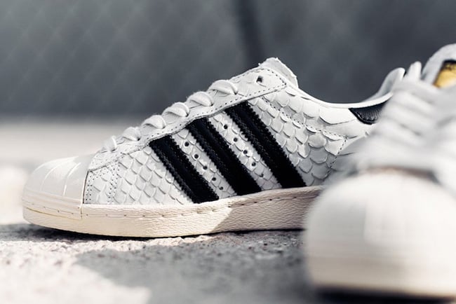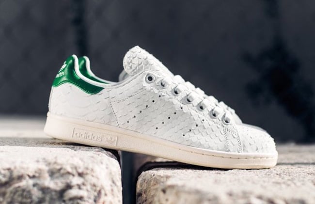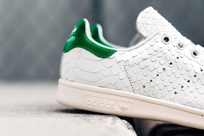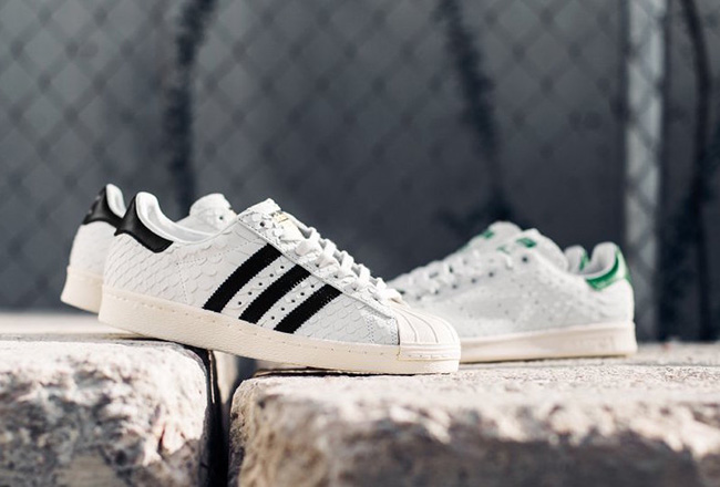 The two pairs shown are the classic adidas Stan Smith and the adidas Superstar 80s. Both will come with a White upper along with nubuck material with a snakeskin texture overlay. The Superstar will use leather across the heel tab and Three Stripes down the side which is dipped in Black. The Stan Smith will have perforated Three Stripes branding along with Green on the heel and tongue.