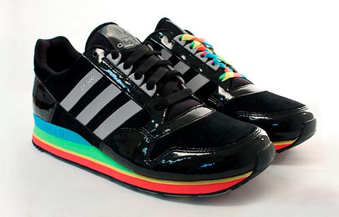 In 2010, adidas seems prepared to continue taking care of its NBA stars and the casual baller. But don’t think it’ll focus any less on its trainer sneakers. The adidas ZX500 pictured here comes in a predominantly black upper combination of patent leather and suede throughout the toe box, mid panels, and heel. The patented adidas stripes come in grey, while the sole comes in what resembles a rainbow pattern. In fact, a similar pattern can be found underneath the shoe and on the shoe laces as well. Select adidas retailers are expected to receive pairs of this adidas ZX500 “Rainbow” soon, if they haven’t already. Do you like the use of materials and color scheme administered to this adidas ZX500?