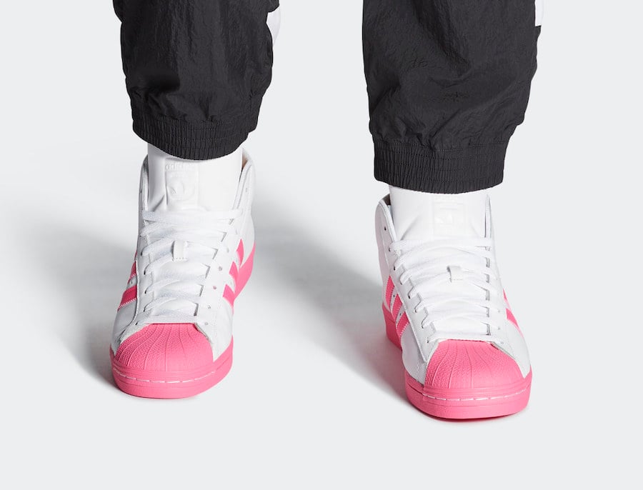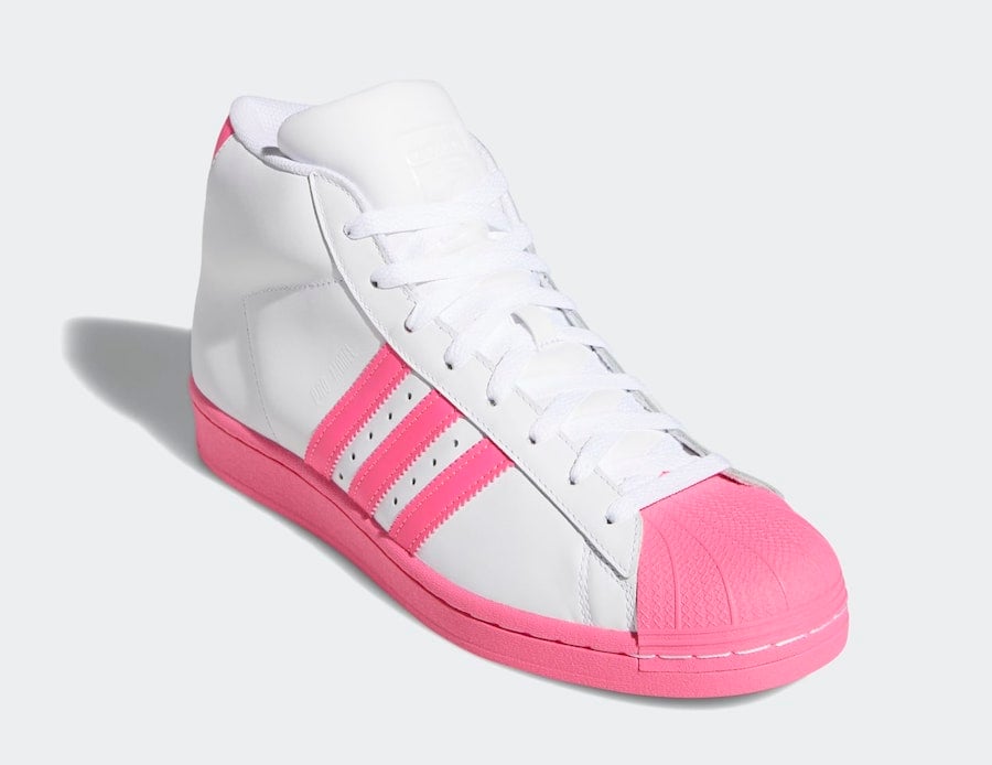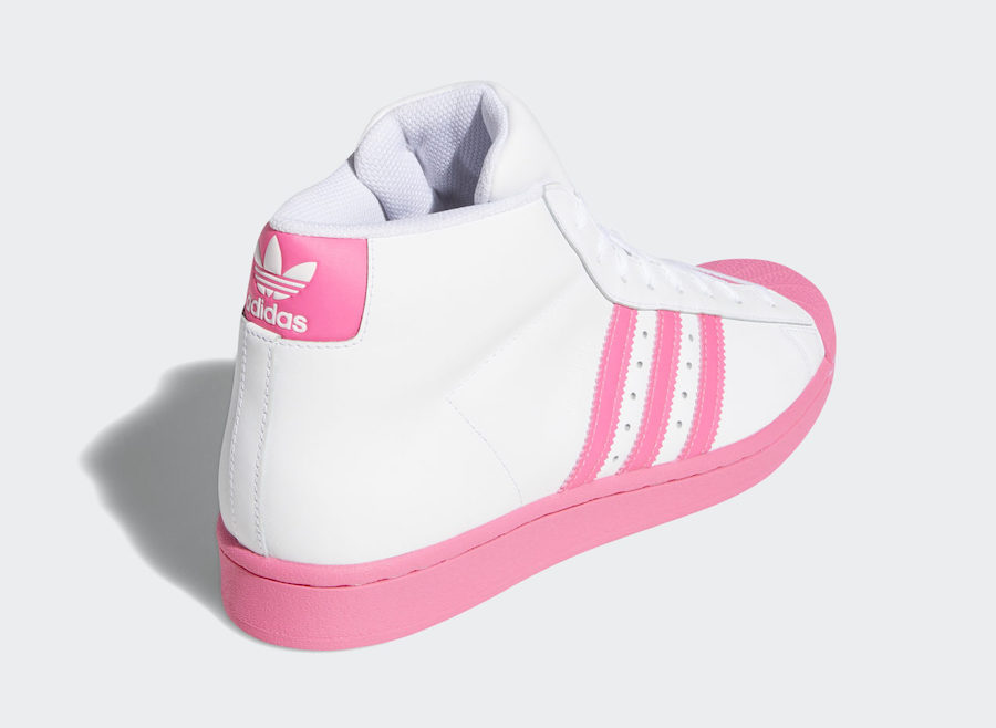 Looking closer this adidas Pro Model comes with White leather throughout the base while Pink leather is applied to the Three Stripes branding. Pink is also seen on the heel, across the shell toe, midsole and rubber outsole which completes the look.