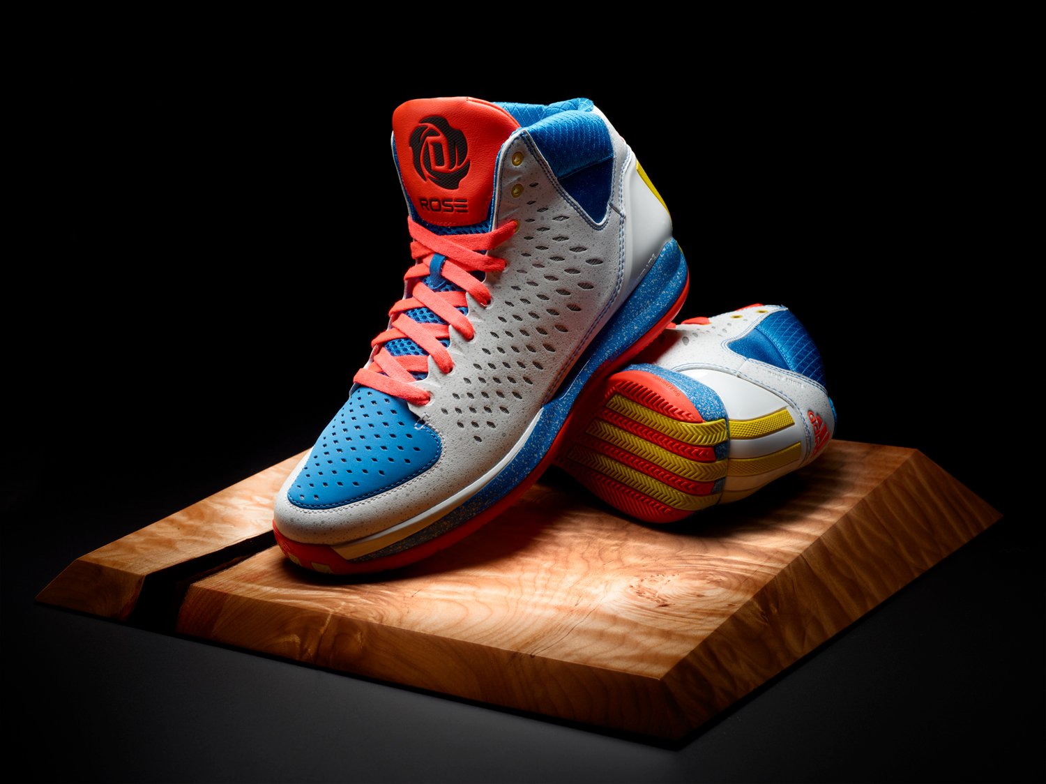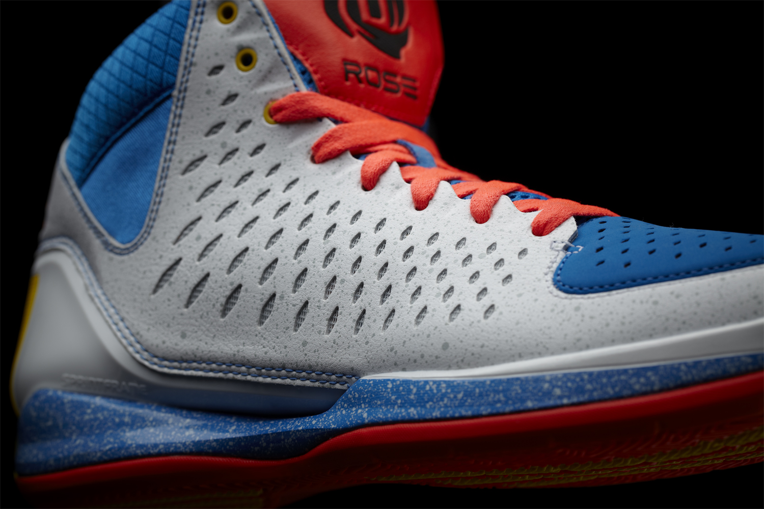 The white synthetic leather upper and midsole feature speckled dots to represent the bright lights of one the worldโs best known avenues. The toe is bright blue nubuck, three stripes and lace eyelets are bright yellow and the tongue, outsole and laces are infrared to represent the iconic characters in the Magnificent Mile Lights Festival parade. The inside of each tongue features stars and a half-moon to represent D Roseโs โPoohdiniโ tattoo. The pattern is encircled by the satellite coordinates of Michigan Avenue and the number 1,000,000 to represent the amount of lights displayed each year during the Magnificent Mile Lights Festival which kicks off Saturday, November 17.