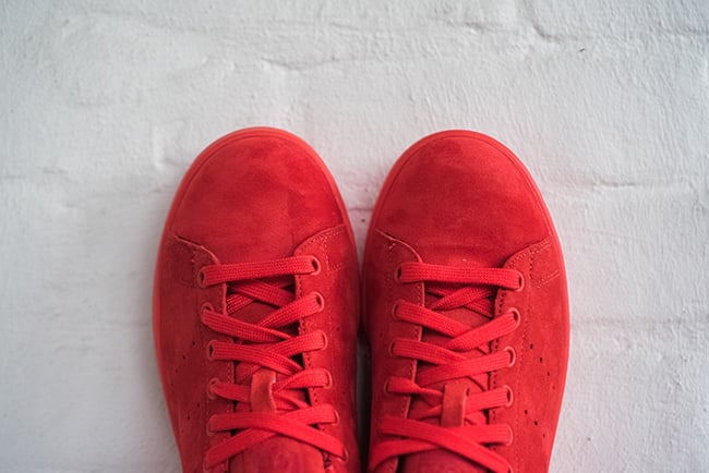 No spot is left untouched by red. Through the base is suede in what the brand is calling ‘powder red’, while the Stan Smith logo on the tongue and Trefoil branding at the heel is embossed.
