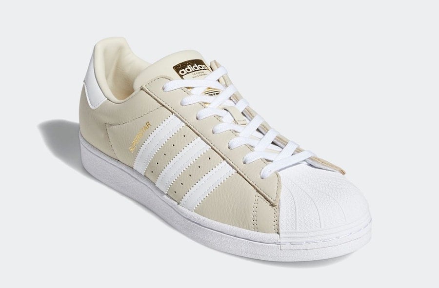 This adidas Superstar features Clear Brown leather across the upper while White leather lands on the Three Stripes branding, shell toe, heel, midsole and rubber outsole. Finishing this simplistic look is Gold on the branding.