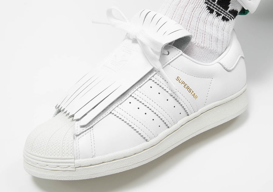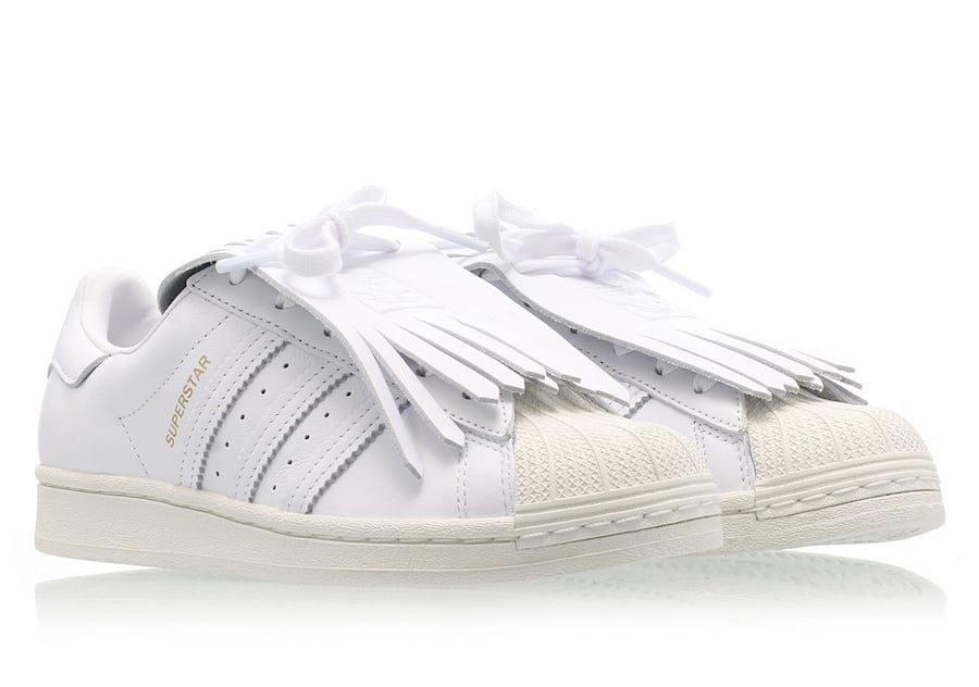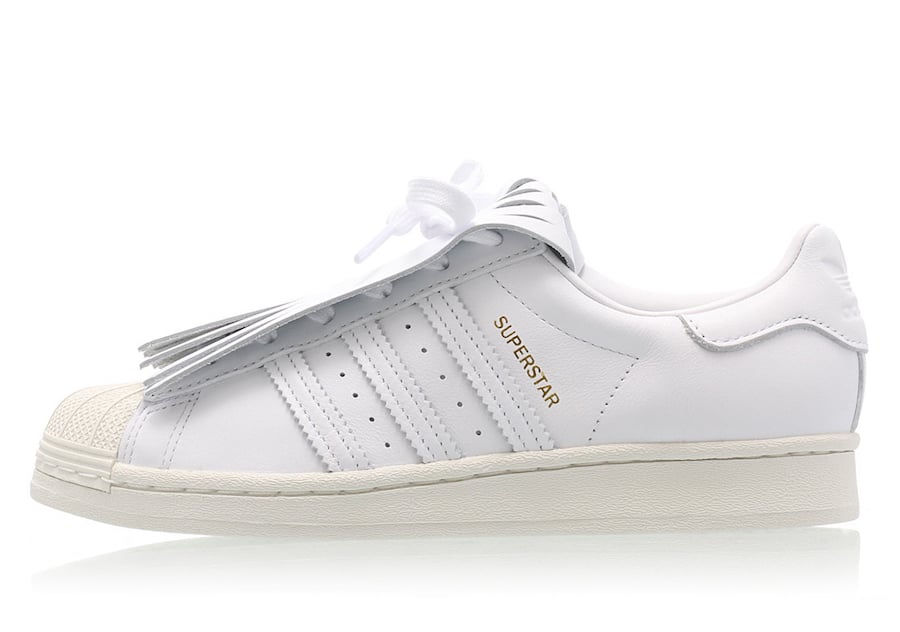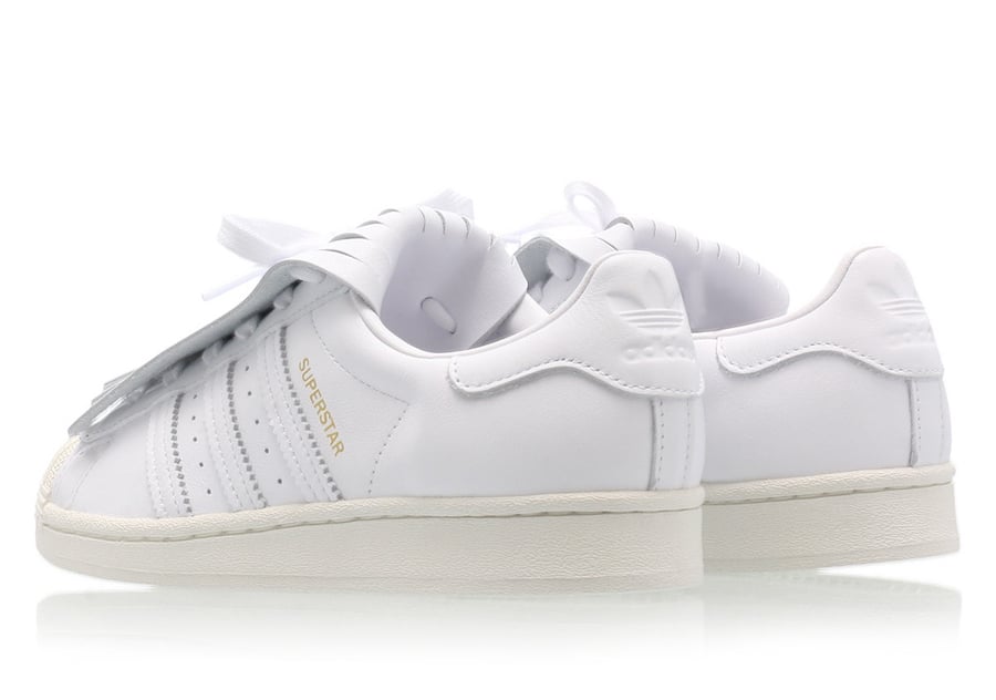 As you can see this Superstar comes with White leather throughout the upper while the same shade covers the rubber shell toe. Following we have Gold used on the branding which lands on the lateral side. The highlight of this pair is fringed lace shield which gives them a luxurious touch.