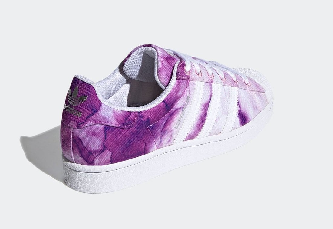 Looking closer, this adidas Superstar features an Ultra Purple, Cloud White, and True Pink color combination. Highlighted with watercolor print across the upper in Purple, which also mixes White. Following, the Three Stripes branding on the panels features White leather. Finally, the signature rubber shell toe, midsole, and rubber outsole finish the look.