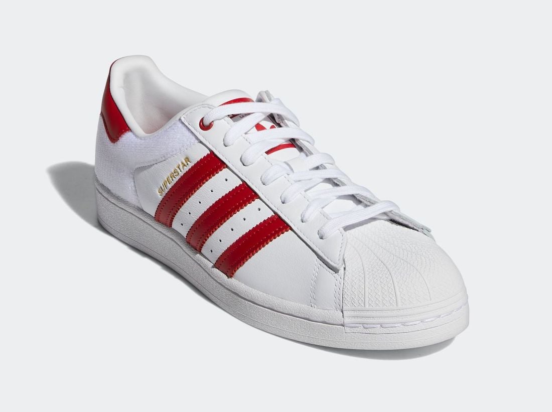 Looking closer this adidas Superstar comes with White leather across the upper while Scarlet Red details land on the Three Stripes branding, tongue and heel. In addition they come with custom patches which you can place on the heel. Other details includes Gold branding on the lateral while White covers the midsole and rubber outsole.