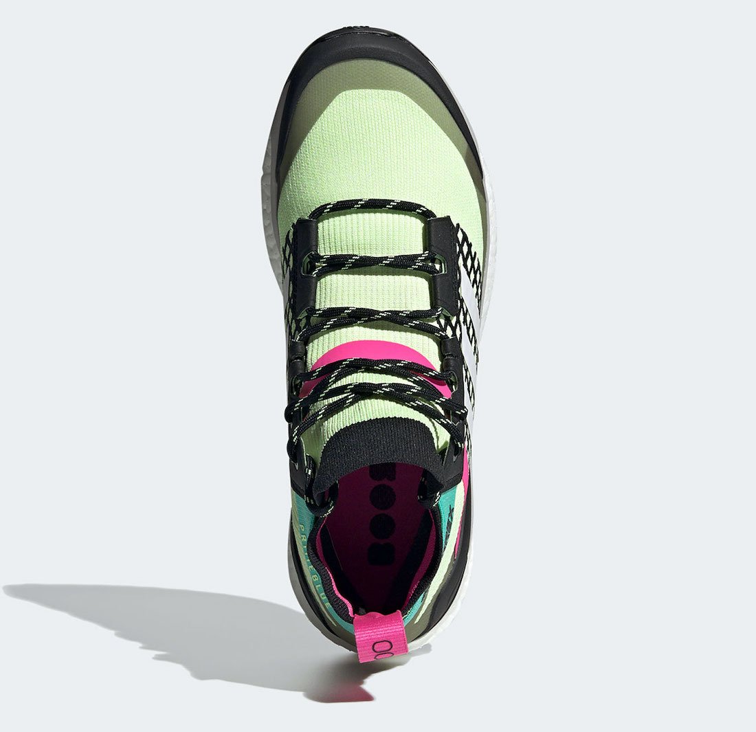 This adidas Terrex Free Hiker features a Hi-Res Yellow, Crystal White, and Core Black color combination. First, Neon Yellow Primeknit across the upper while Black hits the heel counter, wraps the toe, and around the sock-like ankle. Sticking out, we have Pink on the side and heel pull tab while Teal appears on the ankle overlay. Finally, a White Boost midsole and a Black Continental rubber outsole finishes the look.