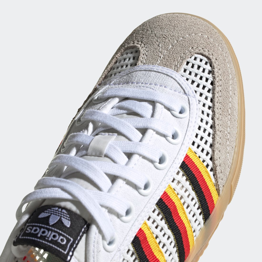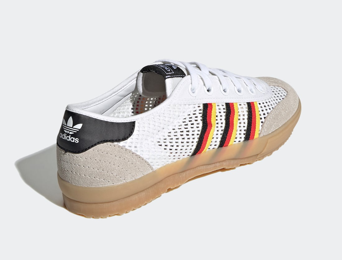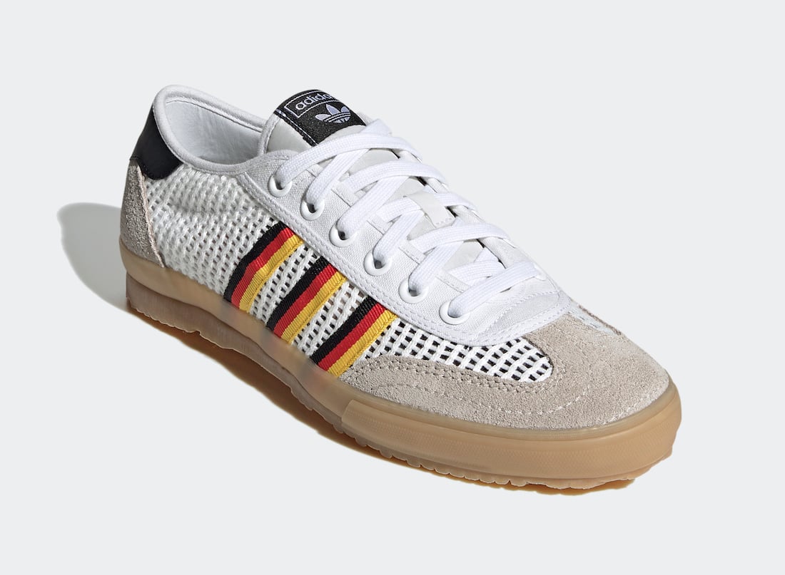 Referencing their German heritage, the sneakers are blanketed in a minimal white contrasted by Red, Black and Yellow flag-inspired accents found to both sides. With the other pair taking on a more saturated mix of Blue, Orange and Yellow, both sneakers sit atop a vintage inspired, slightly concave midsole designed to give players the quick-reflex responsiveness they desired. Boasting added suede overlays to the back and toebox for added durability when worn, they come finished with iconic branded detailing and paddle adorned insole.
